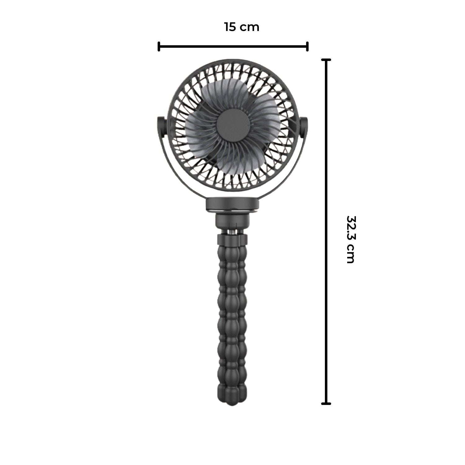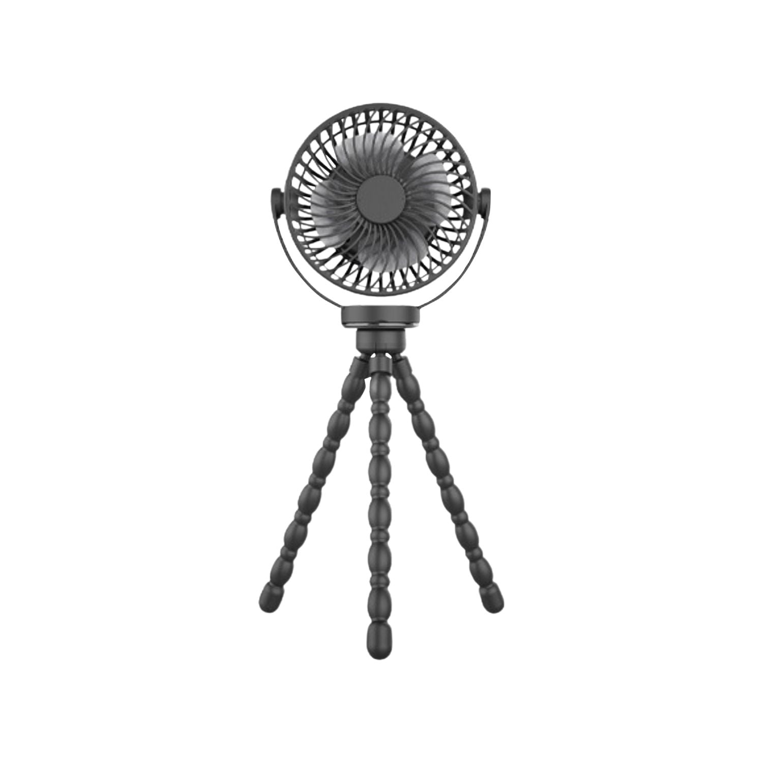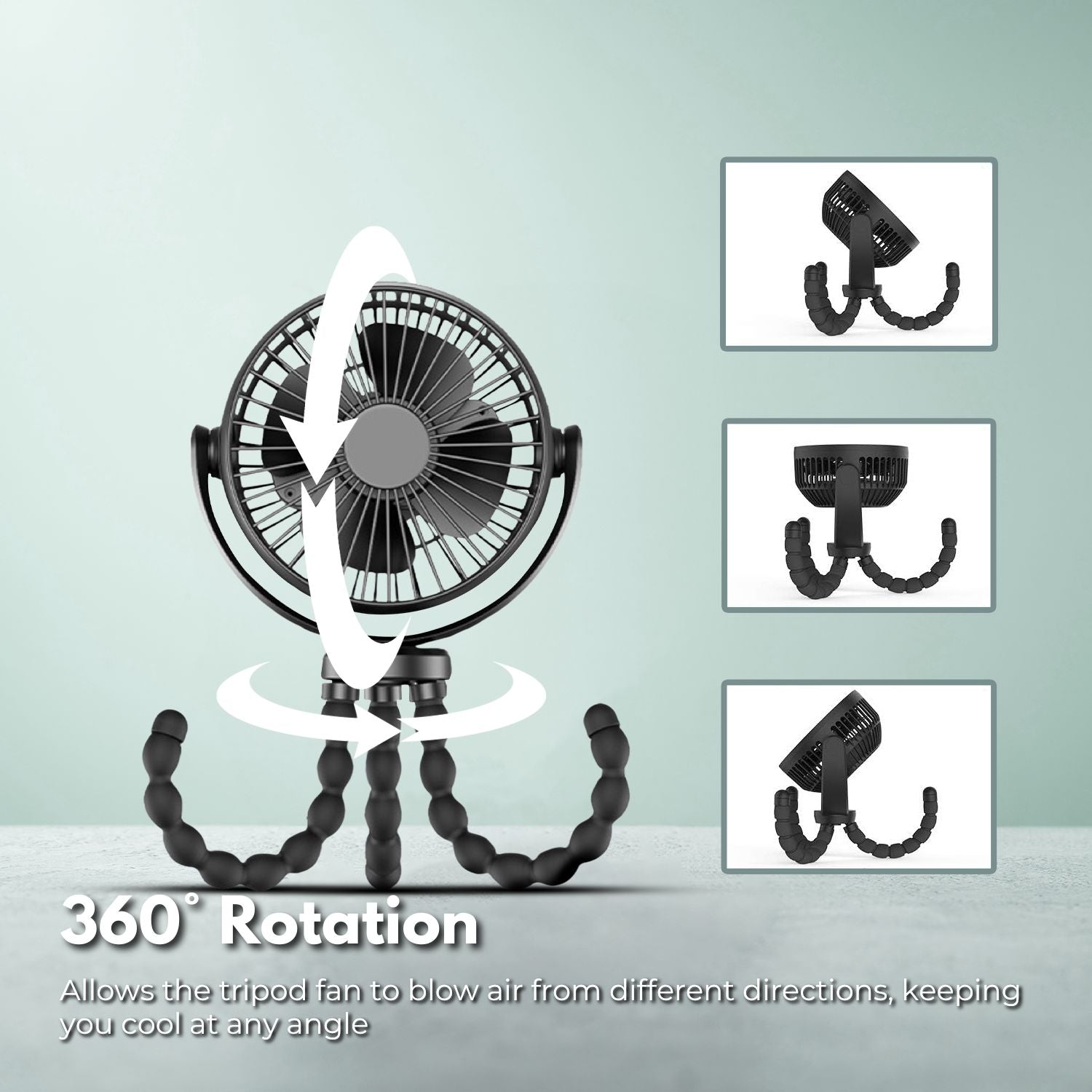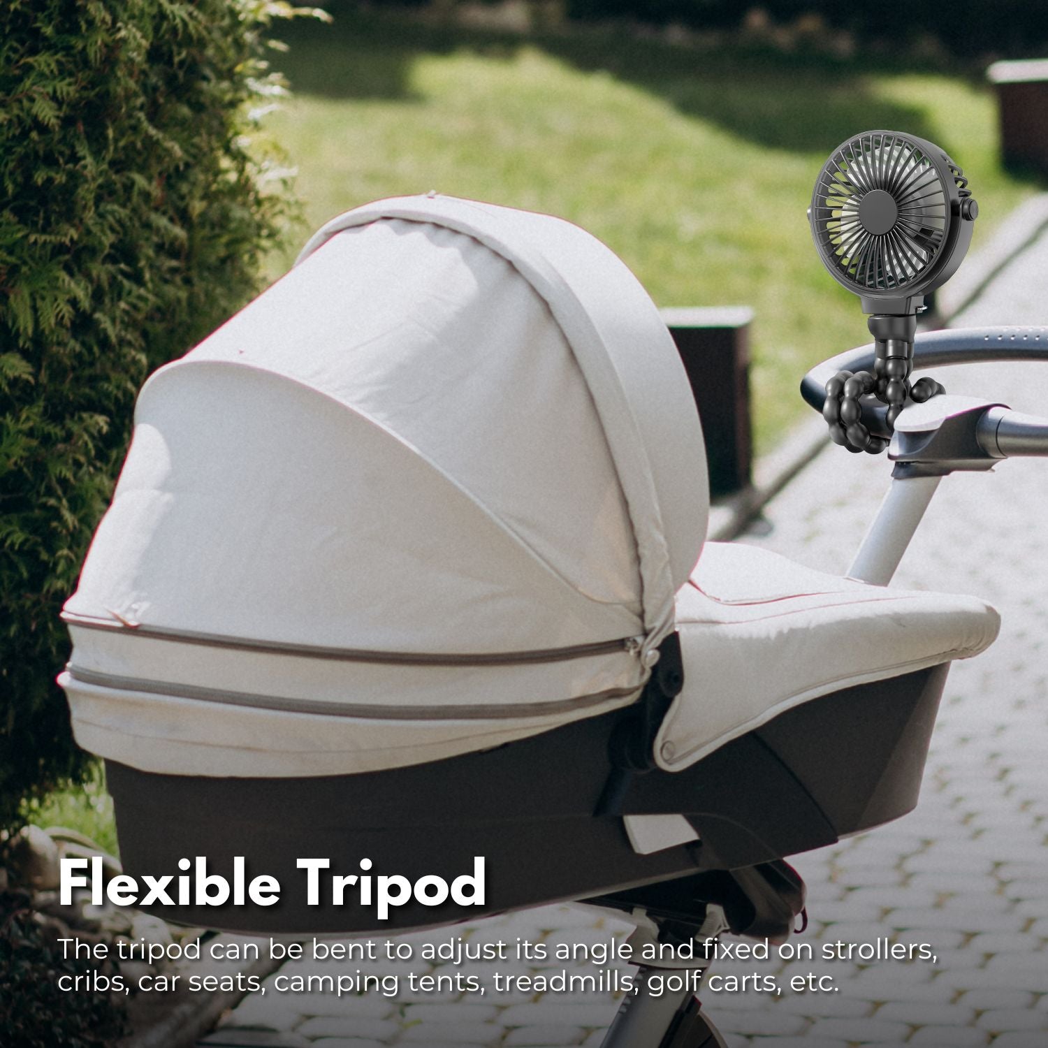 Flexible Tripod for Adjustable Mounting: The tripod is flexible and can be bent to adjust its angle. This feature allows the fan to be easily fixed on various surfaces such as strollers, cribs, car seas. camping tents, treadmills, golf carts, and more.