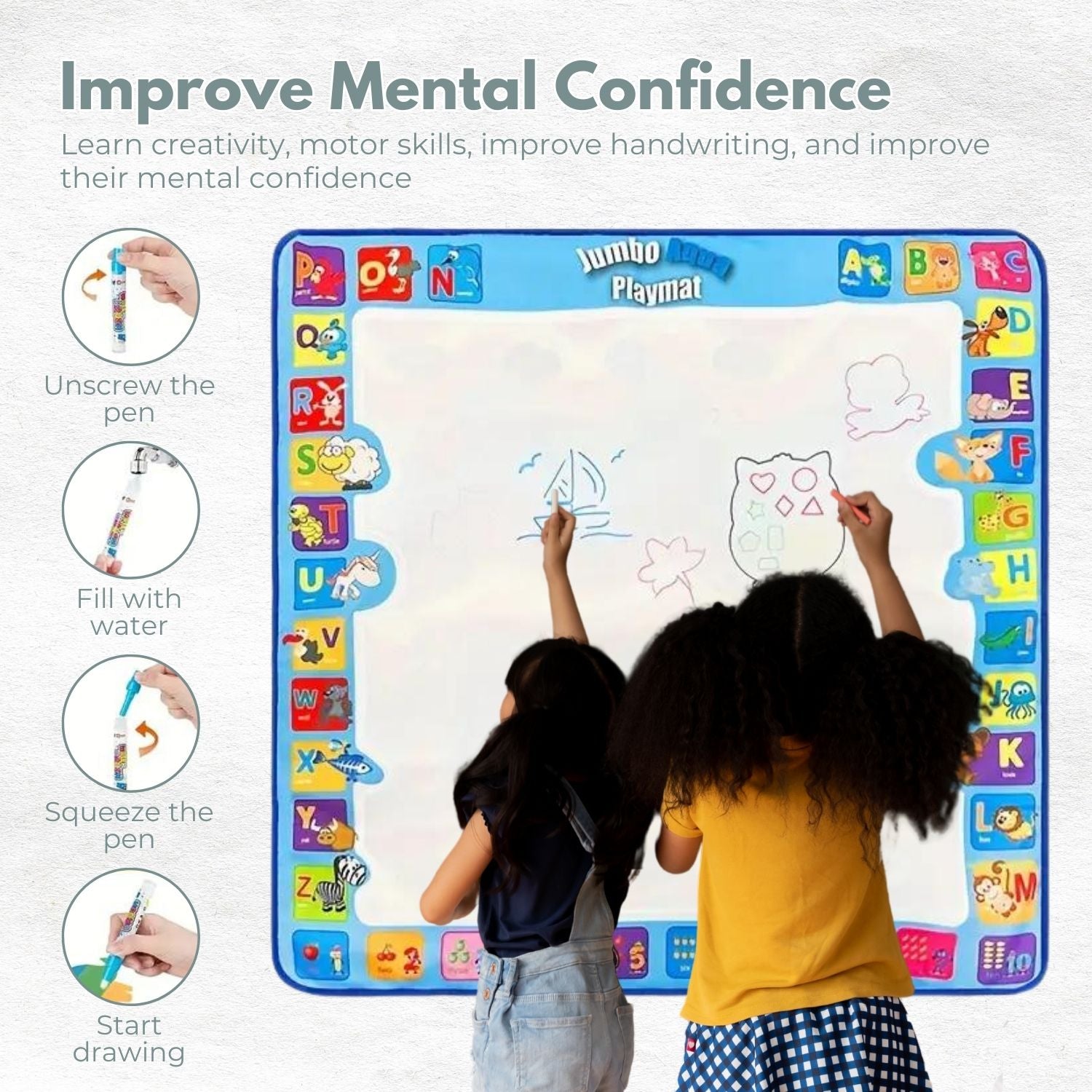Features- Educational Playtime: Keep your children entertained for hours with our water painting mat, where they learn shapes, animals, colors, alphabet/spelling, and numbers/counting. While they engage cognitively, you can focus on work or other tasks.