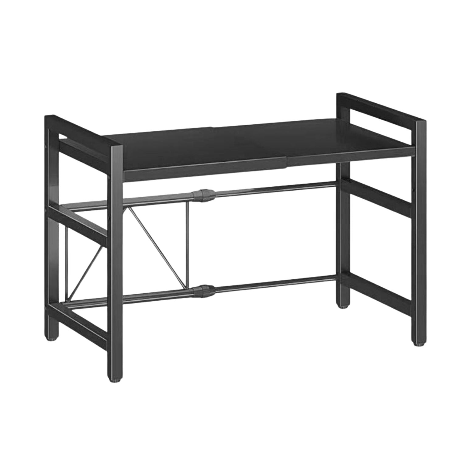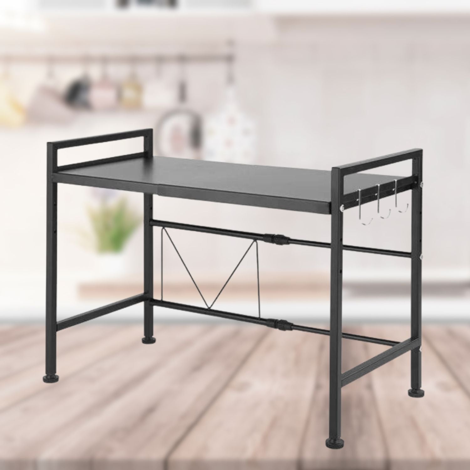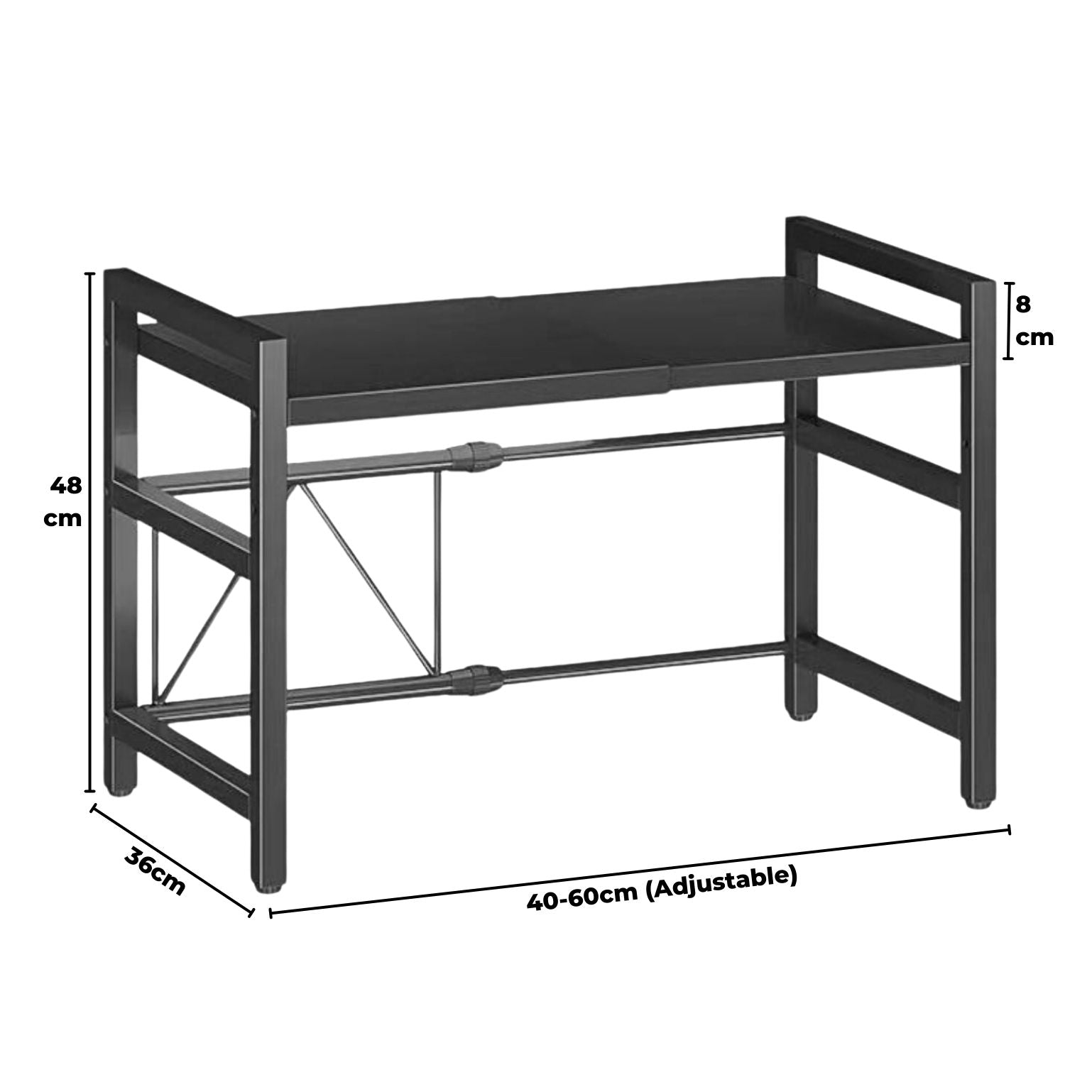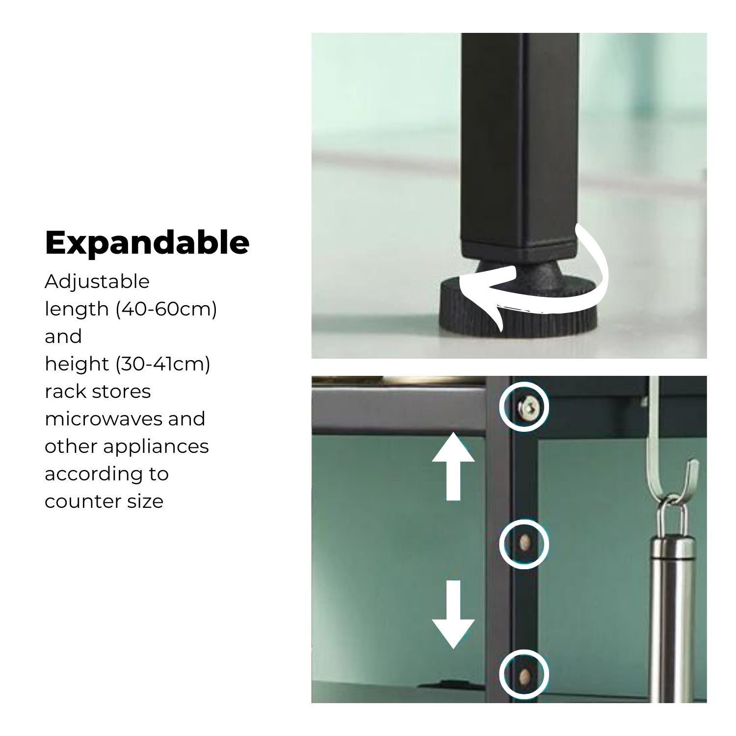 Expandable: Adjustable length (40-60cm) and height (30-41cm) Wuciray rack stores microwaves and other appliances according to counter size.