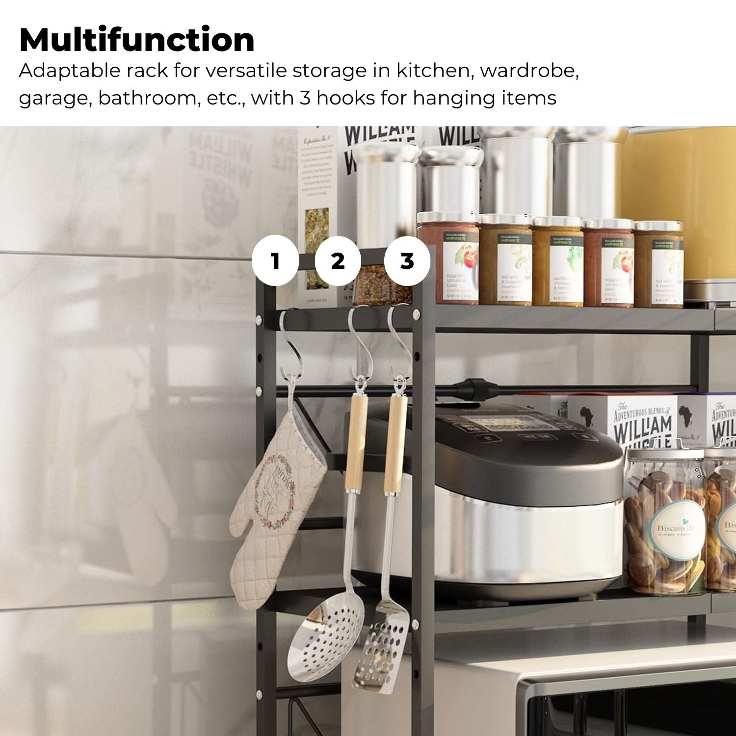Multifunction: Adaptable Wuciray rack for versatile storage in kitchen, wardrobe, garage, bathroom, etc., with 3 hooks for hanging items.