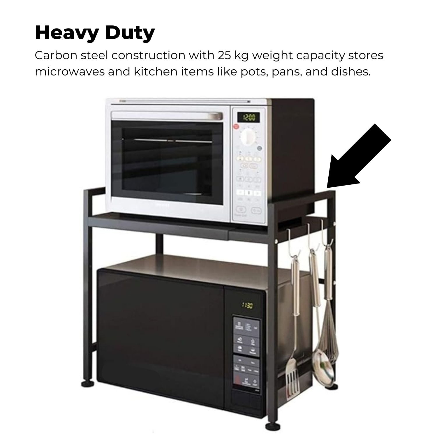 Heavy Duty: Carbon steel construction with 25 kg weight capacity stores microwaves and kitchen items like pots, pans, and dishes.