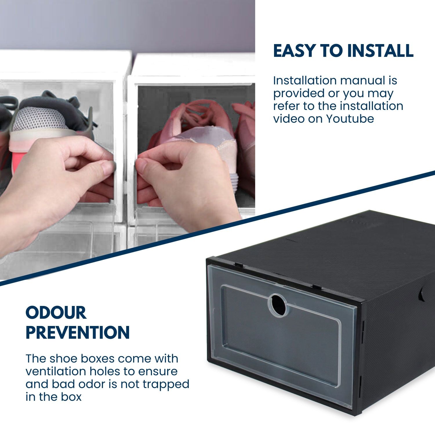 The shoe boxes come with ventilation holes to ensure and bad odour is not trapped in the box. - Random overlay: Designed to be stackable, you can assemble your shoe closet according to your preferences,6/12/24 PCS is available.