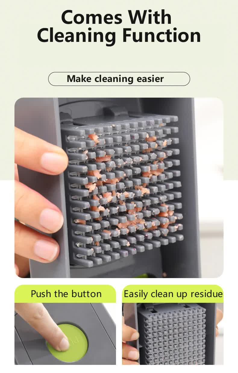 - Easy Cleaning Mechanism: Designed with a convenient push-button cleaning feature on the press plate to easily remove food residue from the dicing grid, making cleanup simpler. A cleaning brush is also typically included for hard-to-reach areas.