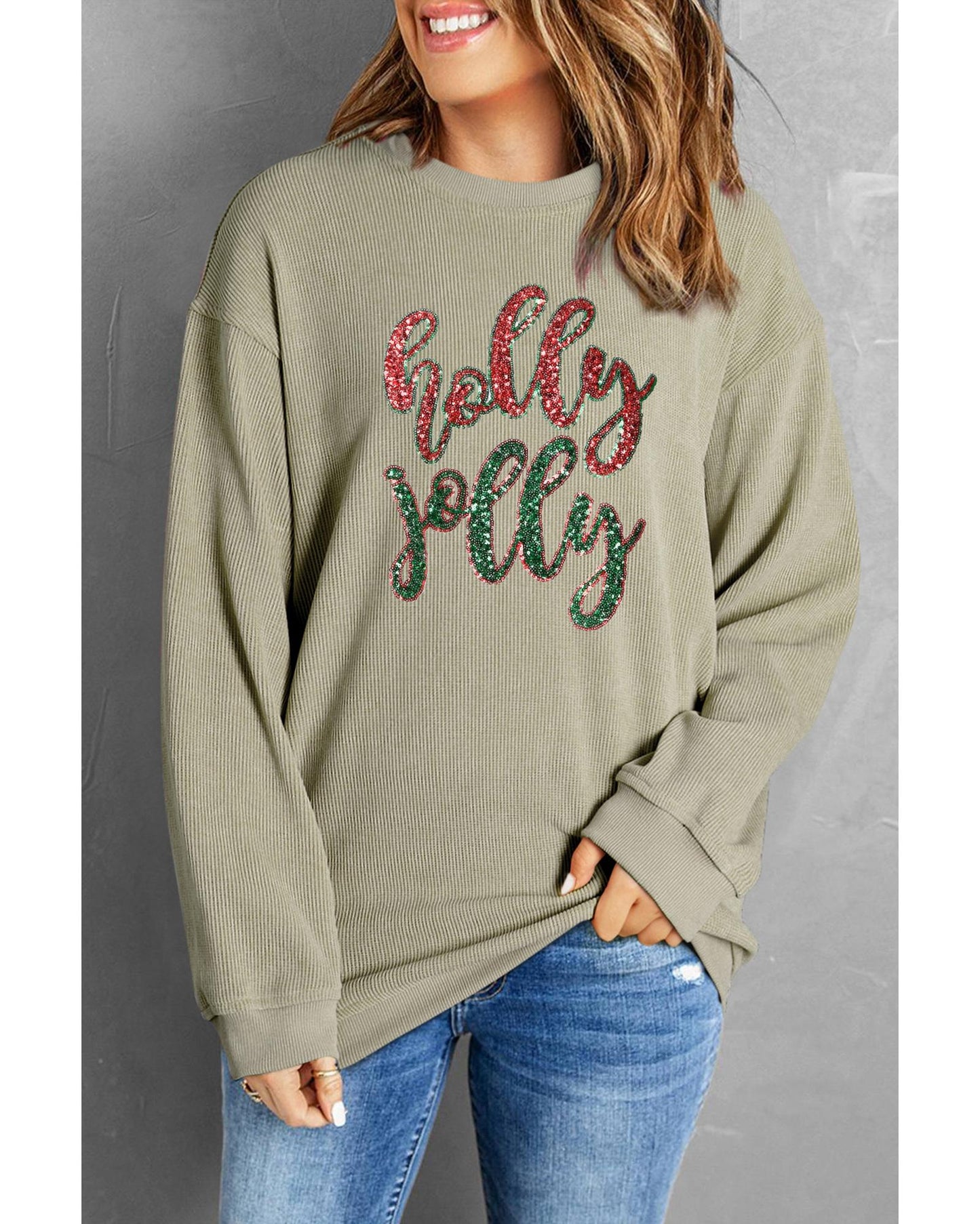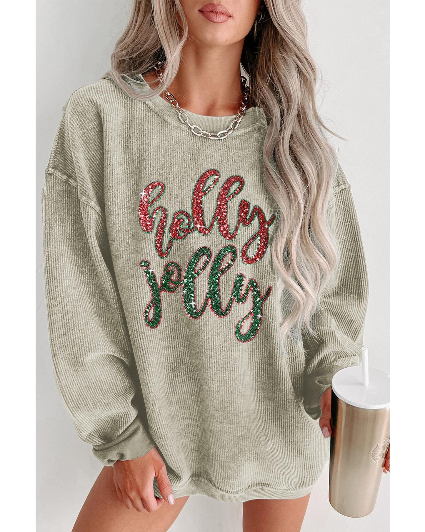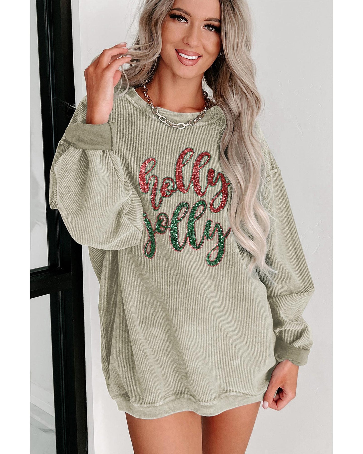 - Green Sequined Holly Jolly Graphic Corded Sweatshirt