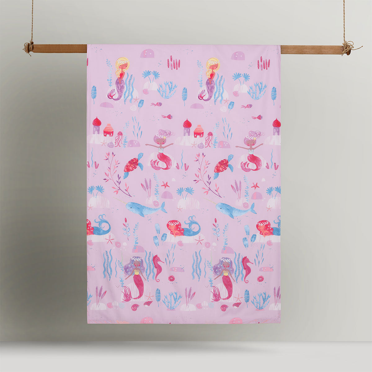 Stay comfortable all year round with this Glow in the Dark Under the Sea Quilt Cover Set by Happy Kids. Great value for money! This bright and fun design could add an element of style to an otherwise plain and boring bedroom decor. The design features mermaids, seahorses, corals, and aquatic plants printed in pink, plum, blue, lilac, orange, and cream colour tones. To activate the glow in the dark feature of the Quilt Cover the lights must be left on for at least 15 minutes. Then simply turn off the lights after that and see the cool glow in the dark characters. Complete the look with matching cushion at an extra cost. It is made from quality microfiber polyester fabric.