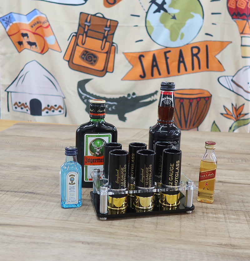 12 Gauge Shotgun Shell Shot Glasses Set of 6 with Acrylic Cup Holder Tray for Barware, Kitchen Storage, Shot Glass liquor Tray, Whisky Brandy Vodka Rum and Tequila Shot Set