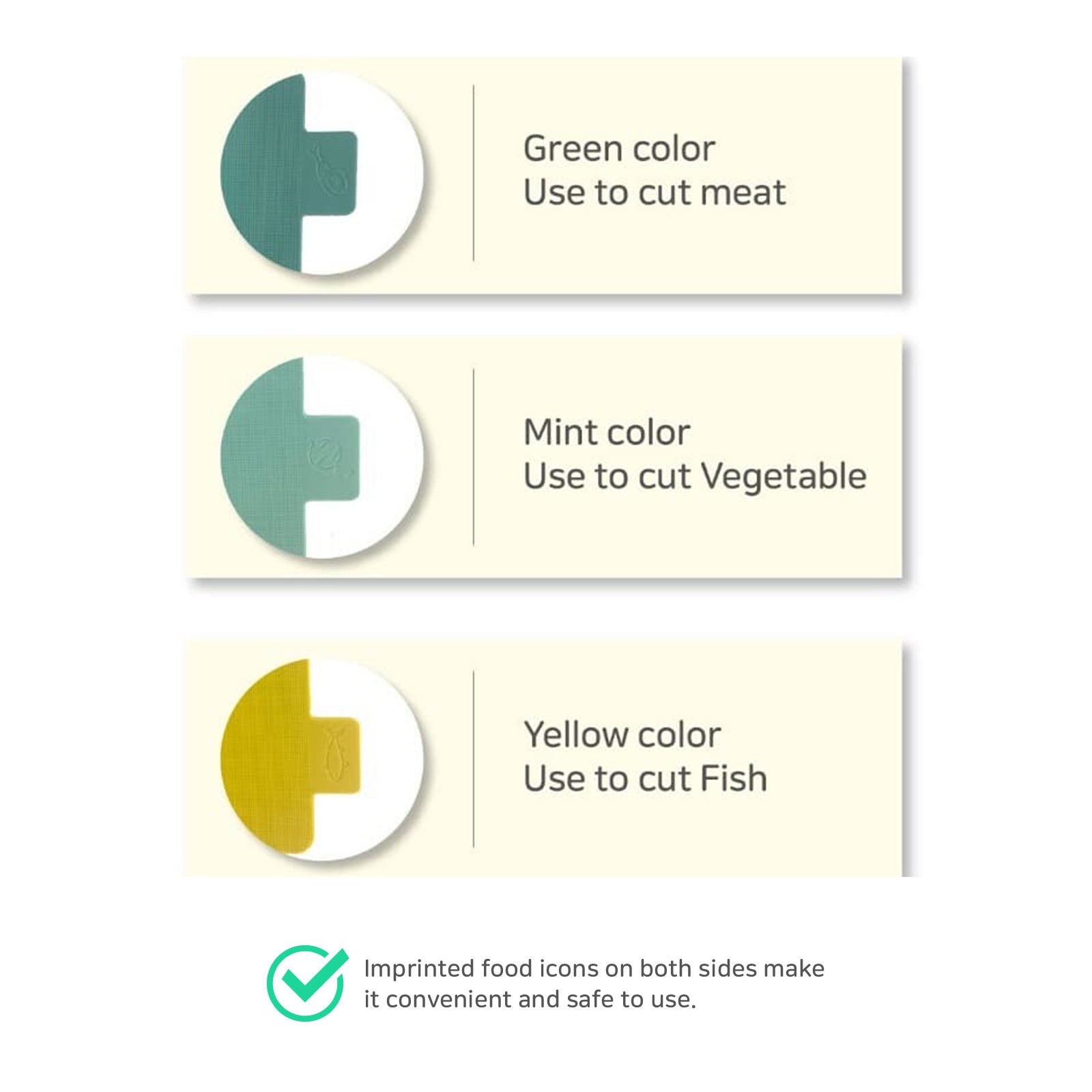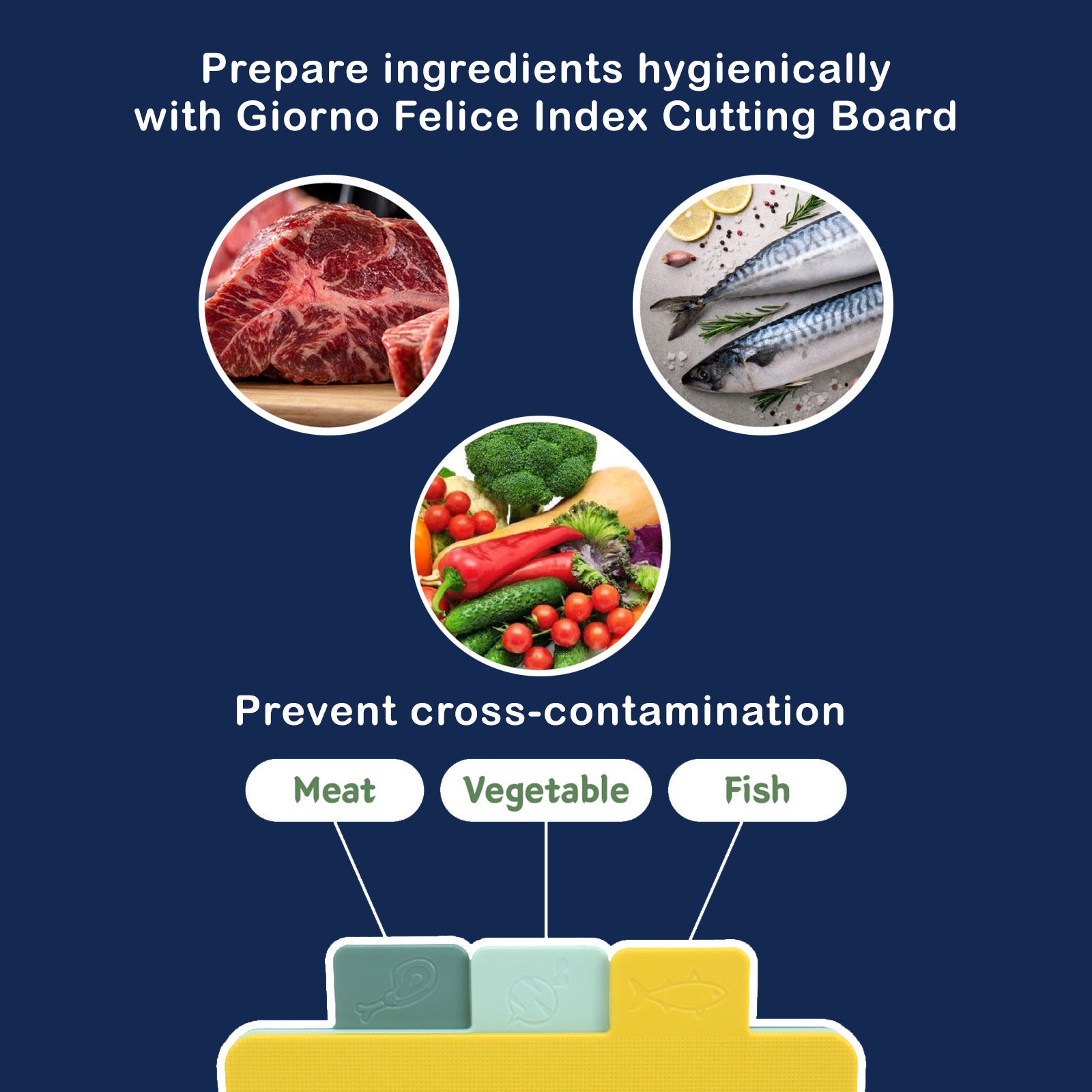 Our cutting board is 100% BPA-Free, prioritizing your well-being. Enjoy worry-free food preparation without harmful chemicals. It's designed for easy, worry-free use, with vibrant colours and food icons to prevent cross-contamination as you switch between meat, vegetables, and fish.