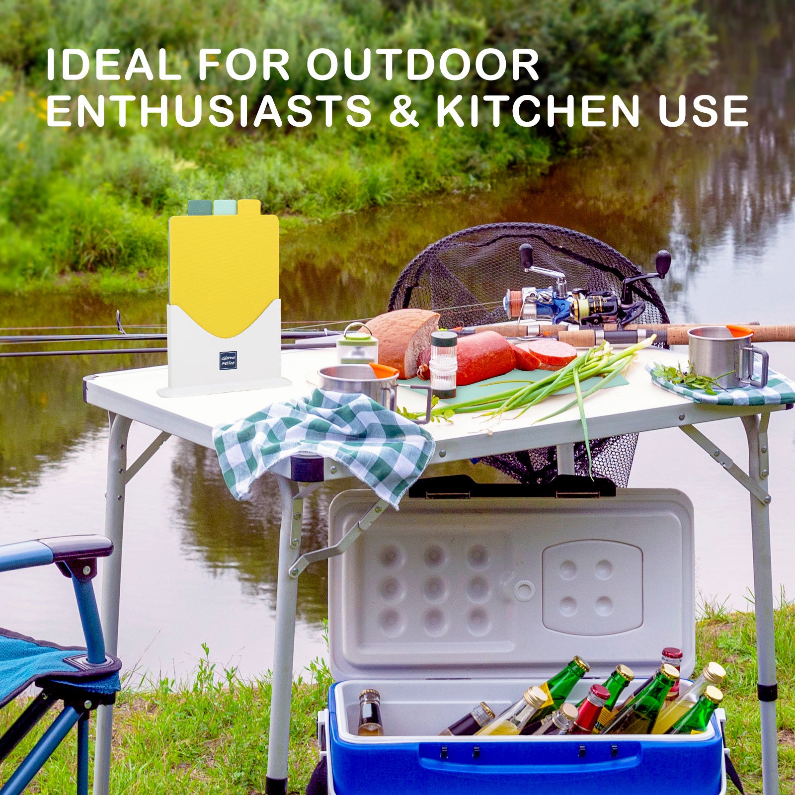 It is an ideal travel companion for camping or fishing trips. Plus, it comes with a sleek, space-efficient holder that keeps your cutting boards organized and adds a touch of sophistication to your kitchen.