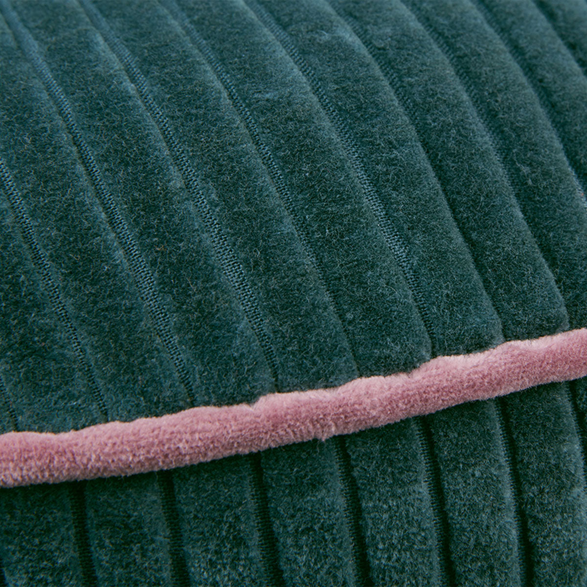 The KAAT Amsterdam Perdy Green Round Filled Cushion 40cm Diameter really stands out. The front and back of this decorative cushion are made of a chic ribbed velvet in green and pink hues. The cushion is finished with double contrast edging. It is the perfect addition to a trendy living room or bedroom. This decorative cushion is available in different colour combinations. Decorative cushion Perdy is made of 100% cotton velvet. The diameter is 40 cm. The cushion comes with a resilient polyester inner cushion. Nice detail: the cushion has a golden puller at the zipper in the shape of an Amsterdam canal house. The cushion is is not suitable for machine washing or tumble drying.