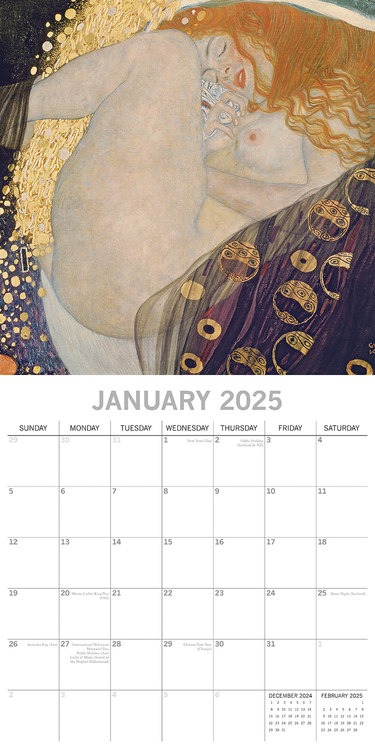 Revel in the ornate beauty of Gustav Klimt with our 2025 calendar. Celebrating his iconic golden phase, each page glistens with intricate patterns and art nouveau charm.This beautifully designed, brand-new calendar is both 100% plastic-free and fully recyclable. It comes shrink-wrapped in its original packaging and features: