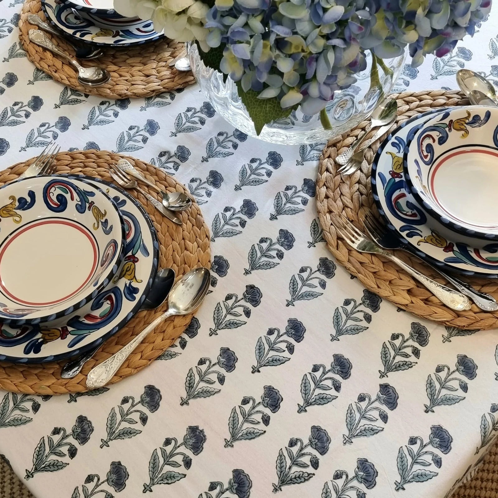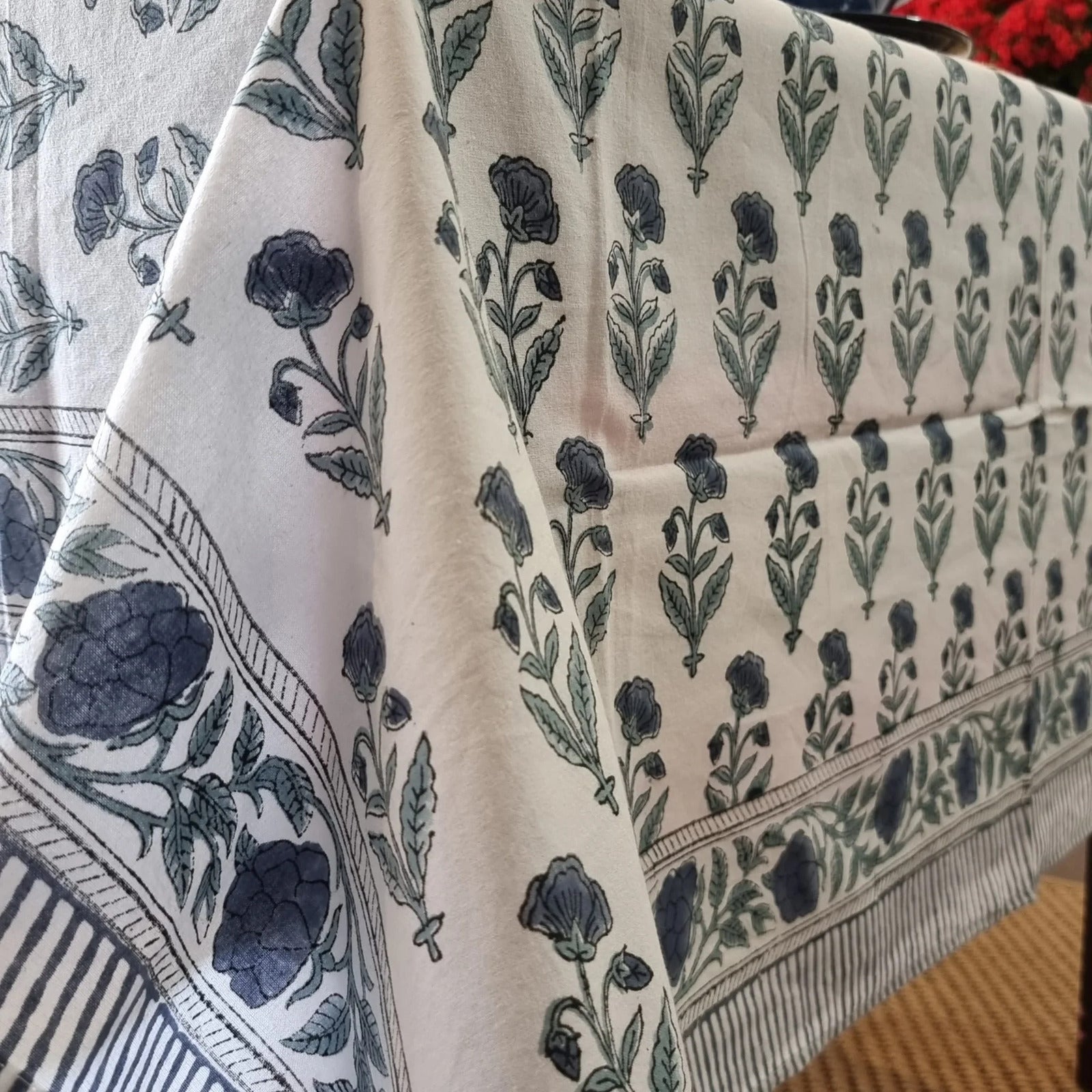 Kasani is a classic floral motif inspired by the Mughal dynasty. A flowering vine border and French ticking stripes wonderfully frame this magnificent botanical pattern. Our hand block-printed tablecloths are artistically created by the skilful artisans in Rajasthan. Tablecloth suitable for a 6 seater dining table.