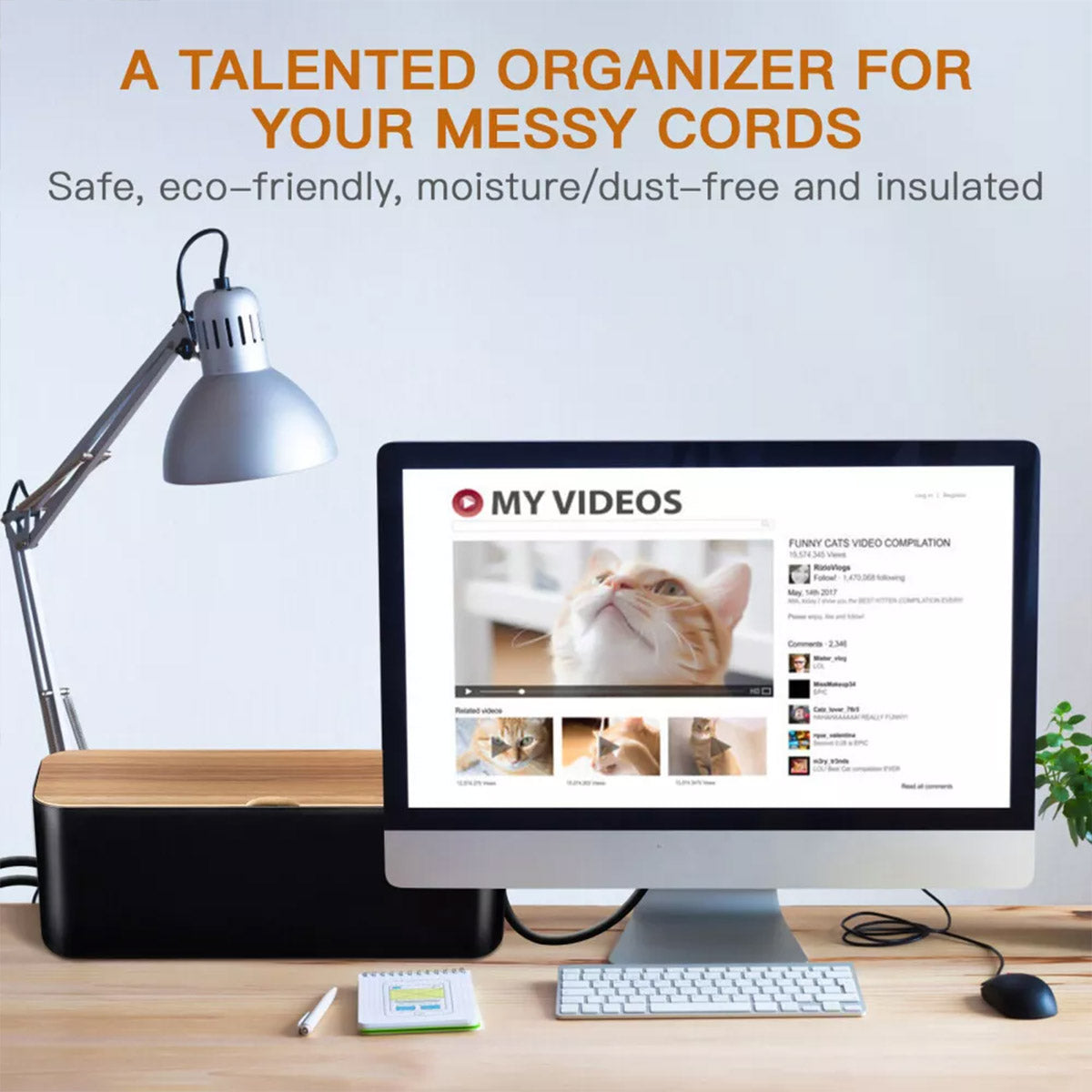 Keep your desk clutter-free and organised with this sleek cable storage box. Designed for managing power strips, wires, and cords, it provides a safe and neat solution for your workspace. Its modern design with a wood-style lid complements various home or office décors.