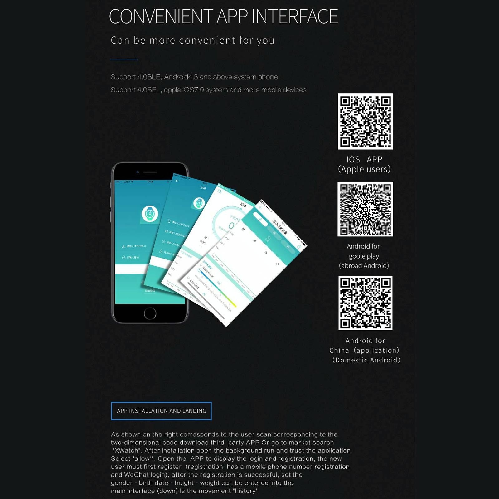 • Push notifications for incoming calls, QQ, WeChat, SMS, Facebook, Twitter, etc.