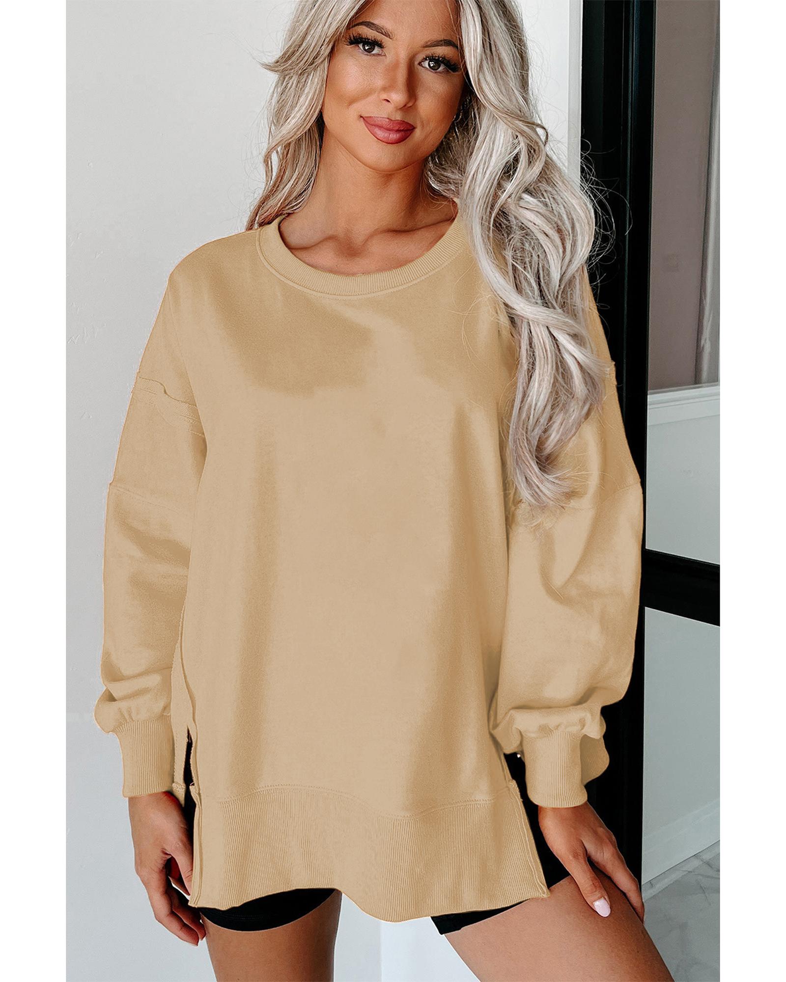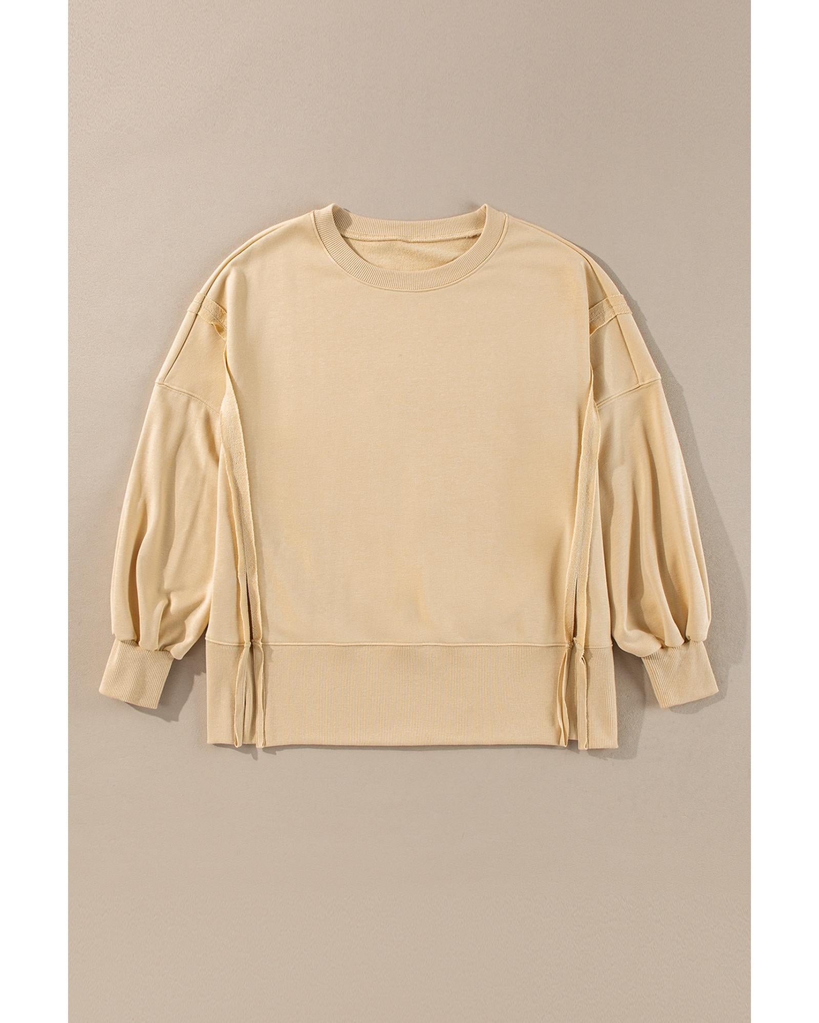 - Light French Beige Exposed Seam Drop Shoulder Round Neck Sweatshirt with Slits