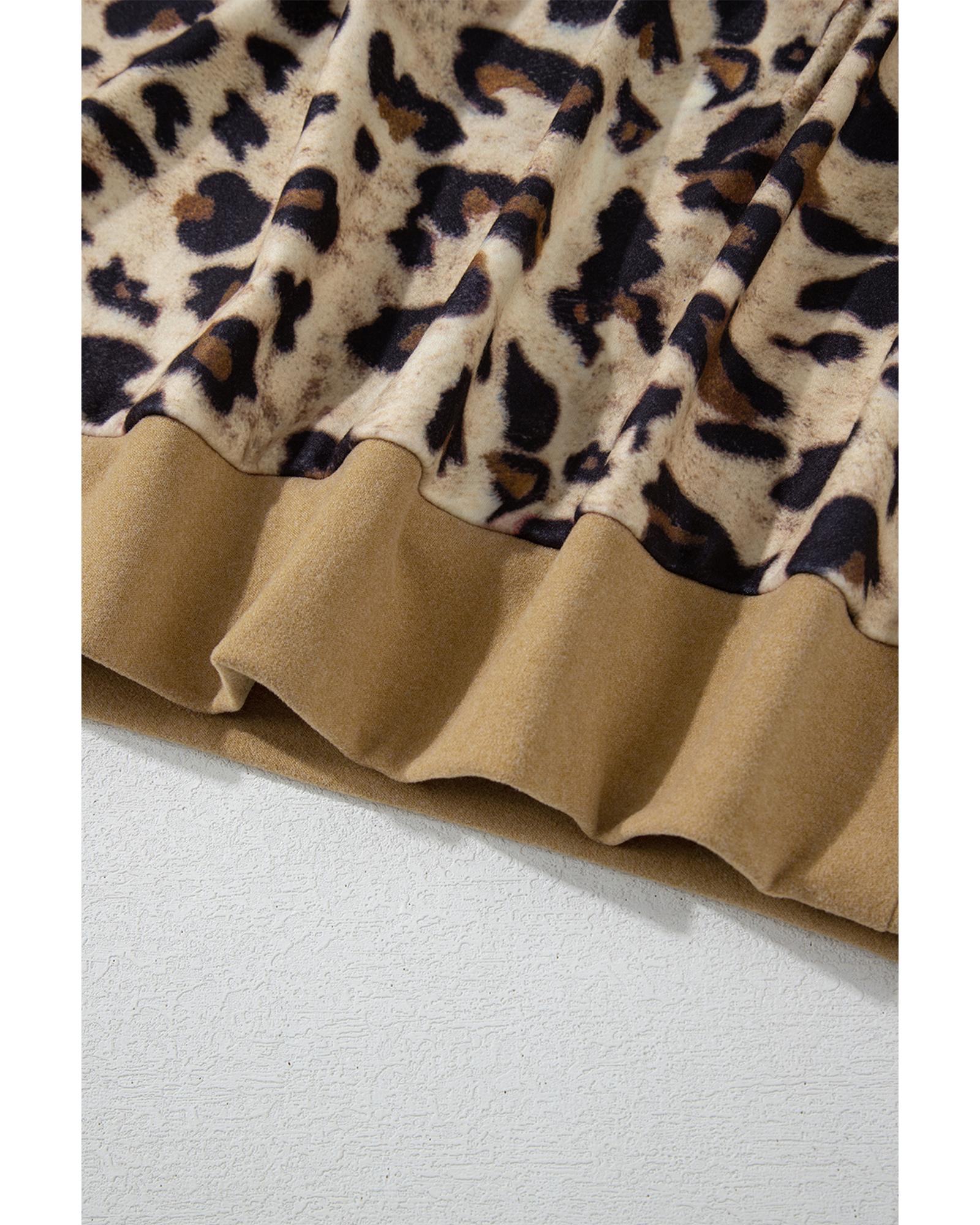 Light French Beige Leopard Print Patchwork Raglan Sleeve Half Buttons Hoodie - M