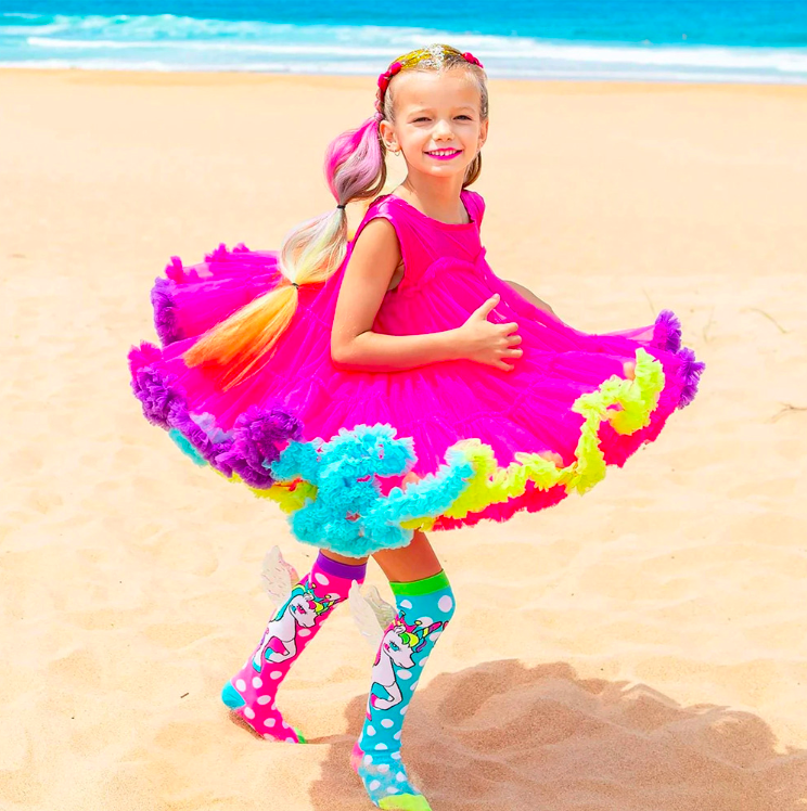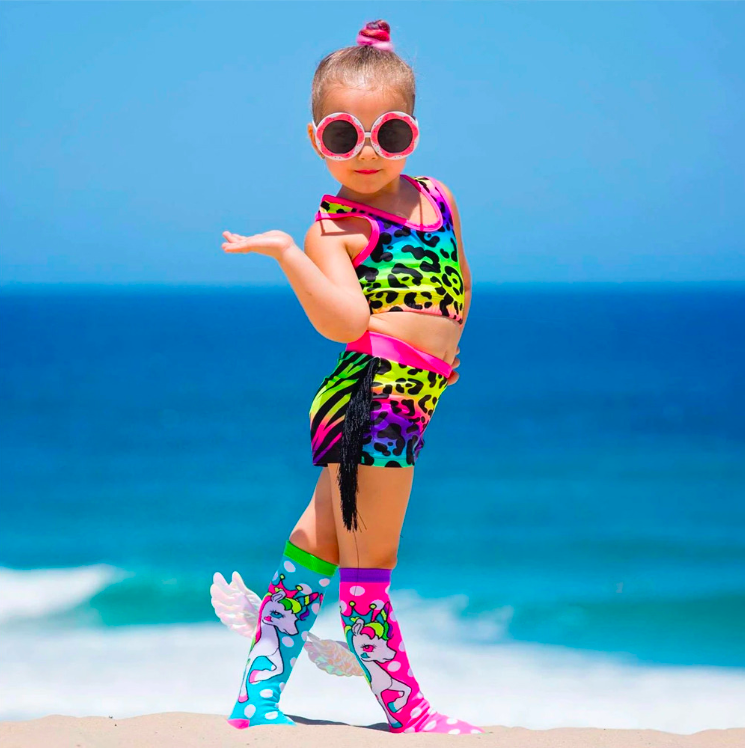 Can we just be unicorns all day, every day? Well, we can! While wearing our MADMIA Flying Unicorn socks. MADMIA Flying Unicorn Socks are a mix and match pair of blue and pink, with polka-dots and a unicorn print. Complete with wings to make you ‘feel’ like you’re flying while dancing!