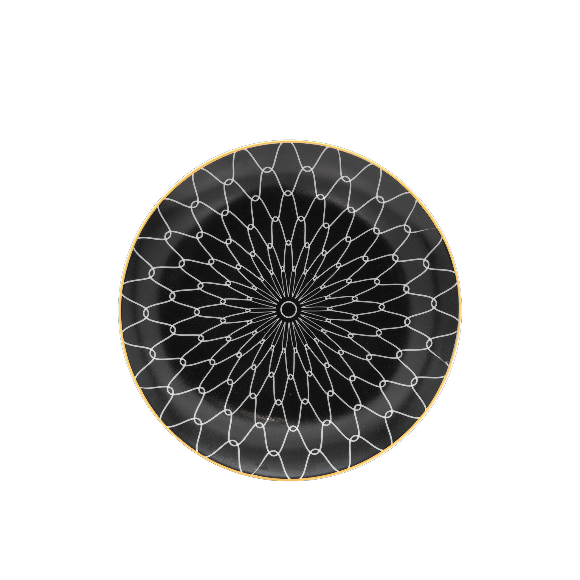 Intricate and sophisticated, this exceptional dinner plates is a testament to traditional craftsmanship and innovative design. The white porcelain plates are brought to life with delicate, hand-applied accents in black. The Chaine motifs, which radiate from the center like a kaleidoscope, create an illusion of movement and depth that elevate tableware to art