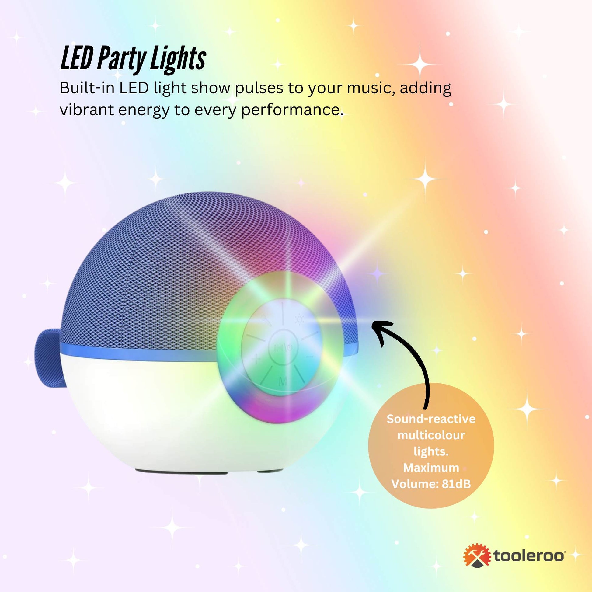 - LED Party Lights – Built-in LED light show pulses to your music, adding vibrant energy to every performance.