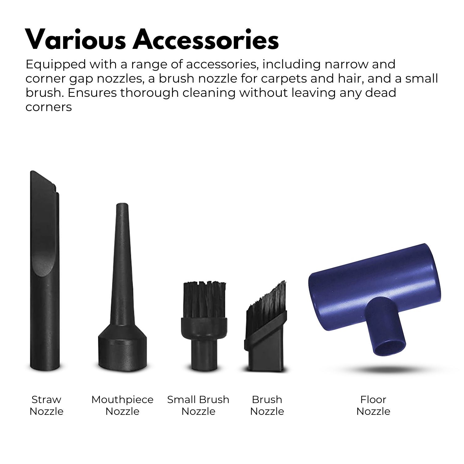 - Various Accessories: The handheld vacuum cleaner includes a range of accessories for comprehensive cleaning. Features narrow and corner gap nozzles, a brush nozzle for carpets and hair, a small brush, and a floor brush. Ensures cleaning without leaving any dead corners.