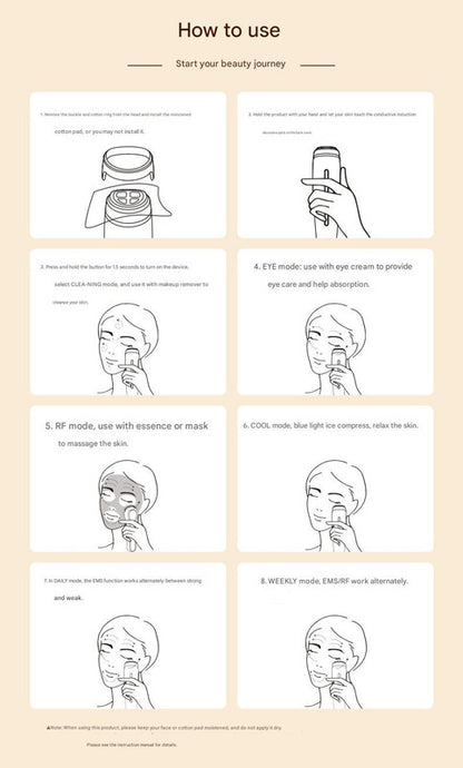 - RF (Red Light) mode: Use with essence or face mask for skin massage.