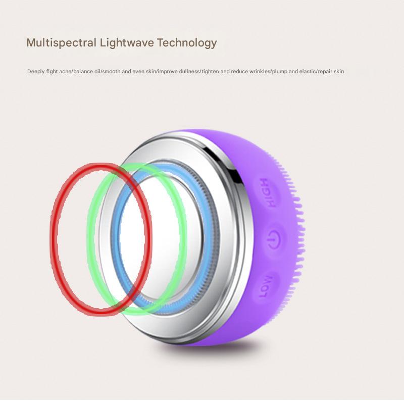 Rejuvenate your skin with our advanced Multi-Spectrum LED Facial Cleansing and Massaging Device. This all-in-one beauty tool combines deep cleansing, product infusion, and skin therapy to help you achieve a flawless, youthful complexion. It features a gentle silicone brush for cleansing and makeup removal (when used with a cotton pad and fixing ring), multi-spectrum light wave technology for various skin benefits, thermal technology to promote skin comfort and open pores, sonic vibration to increase skin elasticity, and EMS micro-current to stimulate ATP production. With multiple modes including Export Mode (Blue Light), Cleansing Mode (Green Light), Import Mode (Red Light), and Phototherapy Mode (Multi-spectral Light), this device targets issues like oil imbalance, dullness, fine lines, and skin repair. The warm heat import function enhances the absorption of skincare products for better results. Its ergonomic design and user-friendly interface make it easy to incorporate into your daily skincare routine.