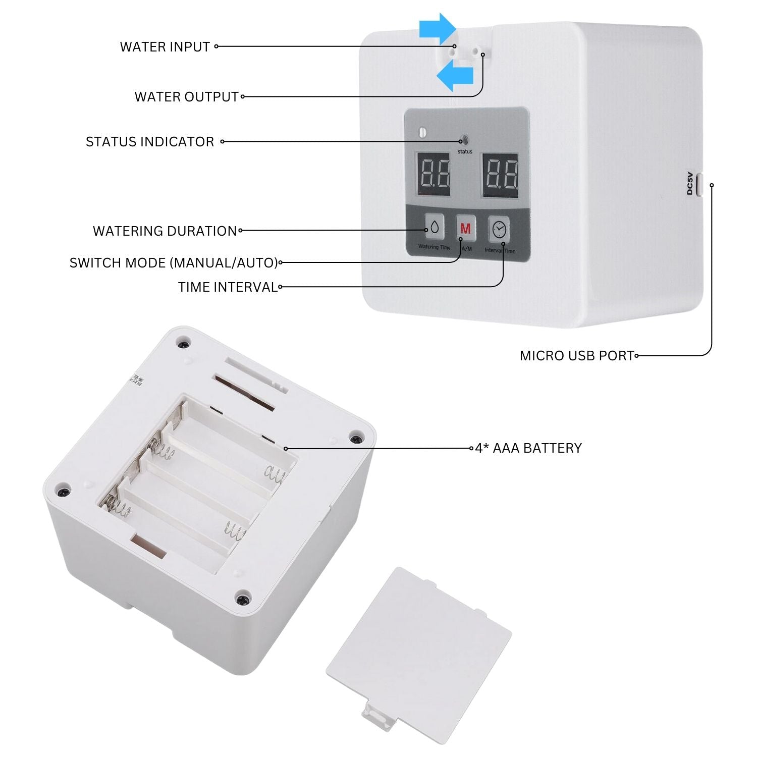 The system is easy to set up and use. You only need to follow a few simple steps to get it up and running. Even if you're not a gardening expert, you can use this system with ease. - Two power supply modes: The system can be powered by either 4xAA batteries (not included) or a USB cable. You can use both methods at the same time to ensure uninterrupted operation, even if one power supply fails.