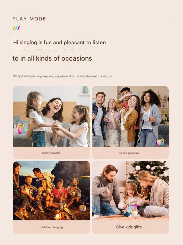 Bring the party anywhere with this fun and stylish Portable Mini Karaoke Machine & Bluetooth Speaker! Combining a high-quality Bluetooth speaker, a wireless microphone, and dazzling RGB lighting effects, this compact system is perfect for home KTV nights, family gatherings, kids' parties, outdoor camping, and more.