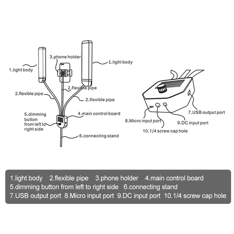• 1 x Rk39 Portable Tri-Colour Adjustable Brightness Double Arms Fill Light With Phone Clip Black