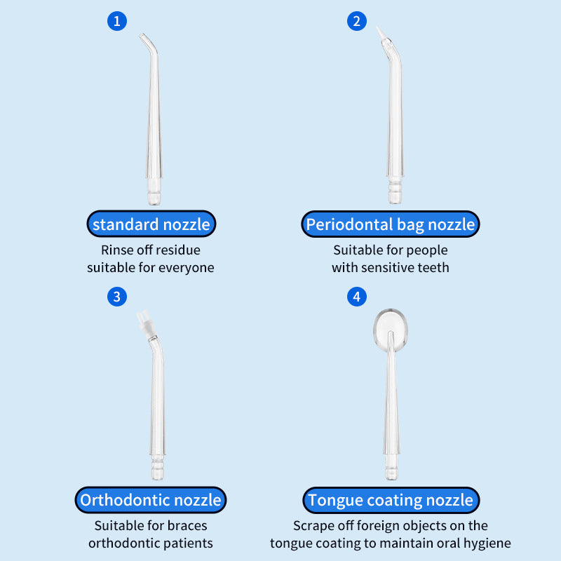 - 4 Nozzles Included: Standard, periodontal, orthodontic, and tongue cleaning options.