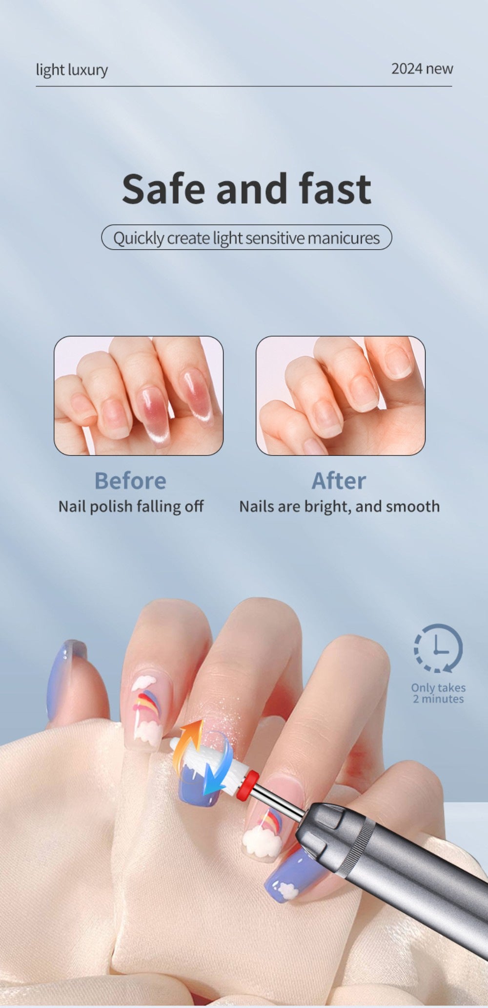 Achieve salon-quality nails at home with this upgraded Electric Nail Polisher. This professional-grade nail drill is designed for a comfortable and efficient experience, featuring an ergonomic grip, low noise, and low vibration operation. With three adjustable speeds and bidirectional rotation, it's perfect for both right and left-handed users. The comprehensive kit includes 12 different polishing heads and sanding bands, allowing you to easily remove nail polish, grind edges and dead skin, and polish nail surfaces for a bright, smooth, and even finish. Its portable, pen-like design and USB rechargeable battery make it the ideal tool for all your manicure and pedicure needs, wherever you are.