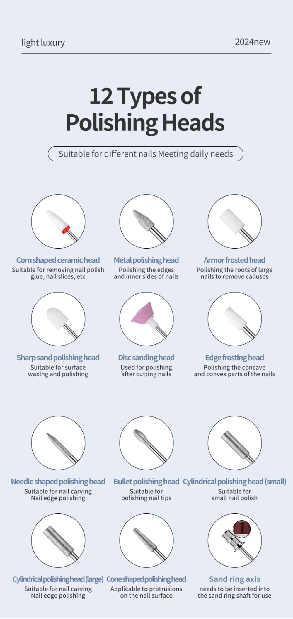 - Versatile 12-in-1 Kit: Includes 12 types of polishing and grinding heads, perfect for removing nail polish, grinding edges, removing dead skin, polishing, and nail carving.