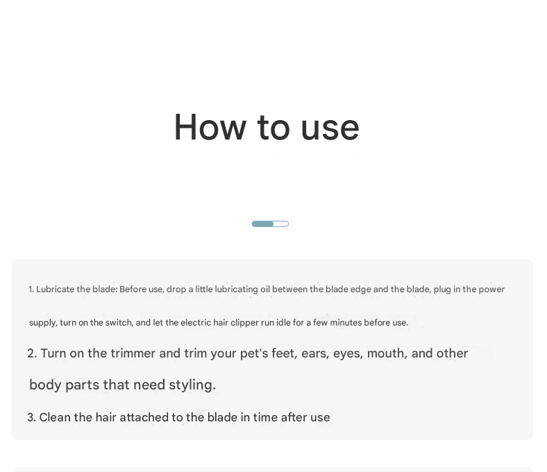 - 2. Gently turn on the trimmer and carefully trim the desired areas on your pet's paws, face, or ears.