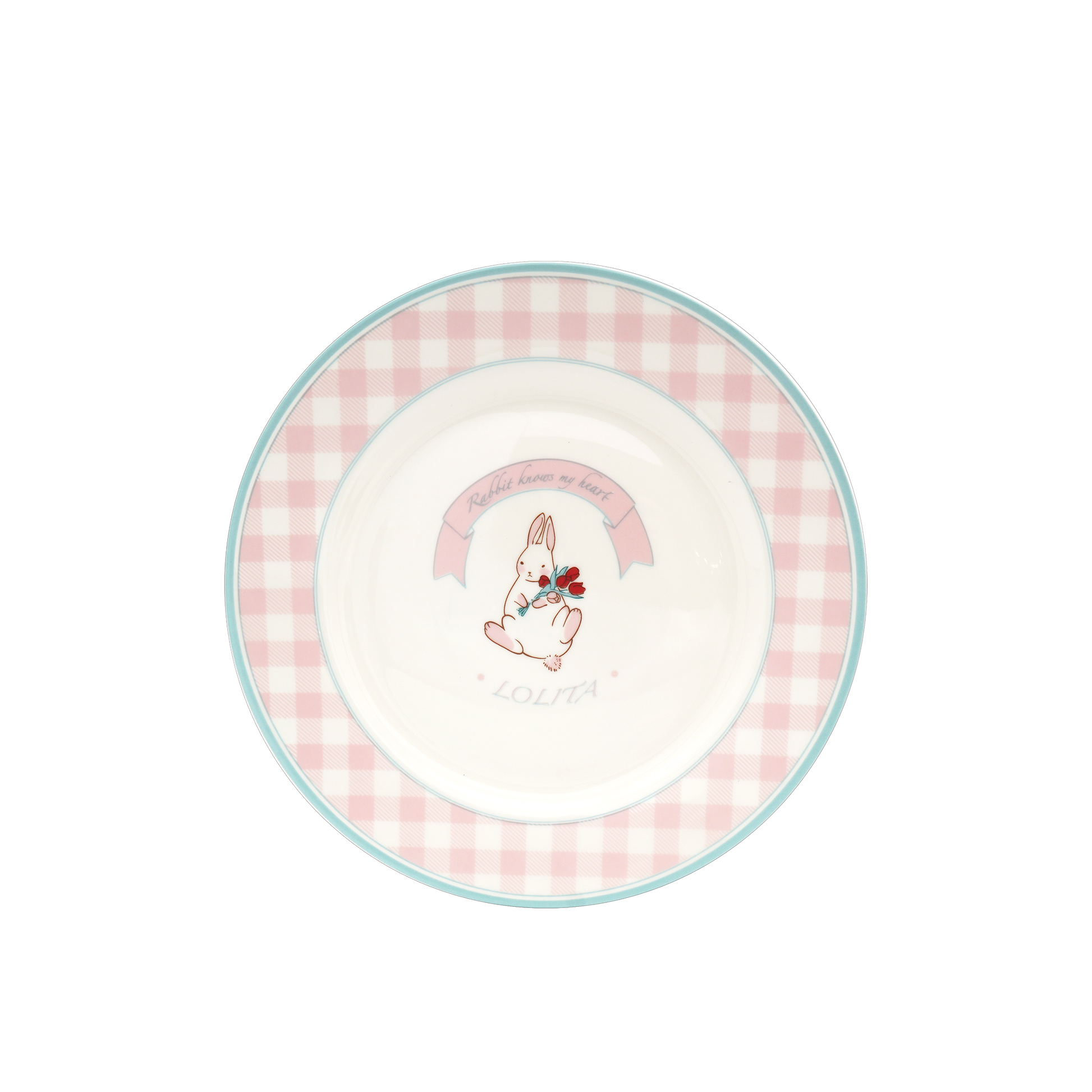 A lively addition to all-white tables, the Rabbit Plate makes a stand-out addition to the kitchen or dining table. It features a hand-painted pink checked print trim with a rabbit in the center, which adds a childishness yet rustic touch to any table setting.