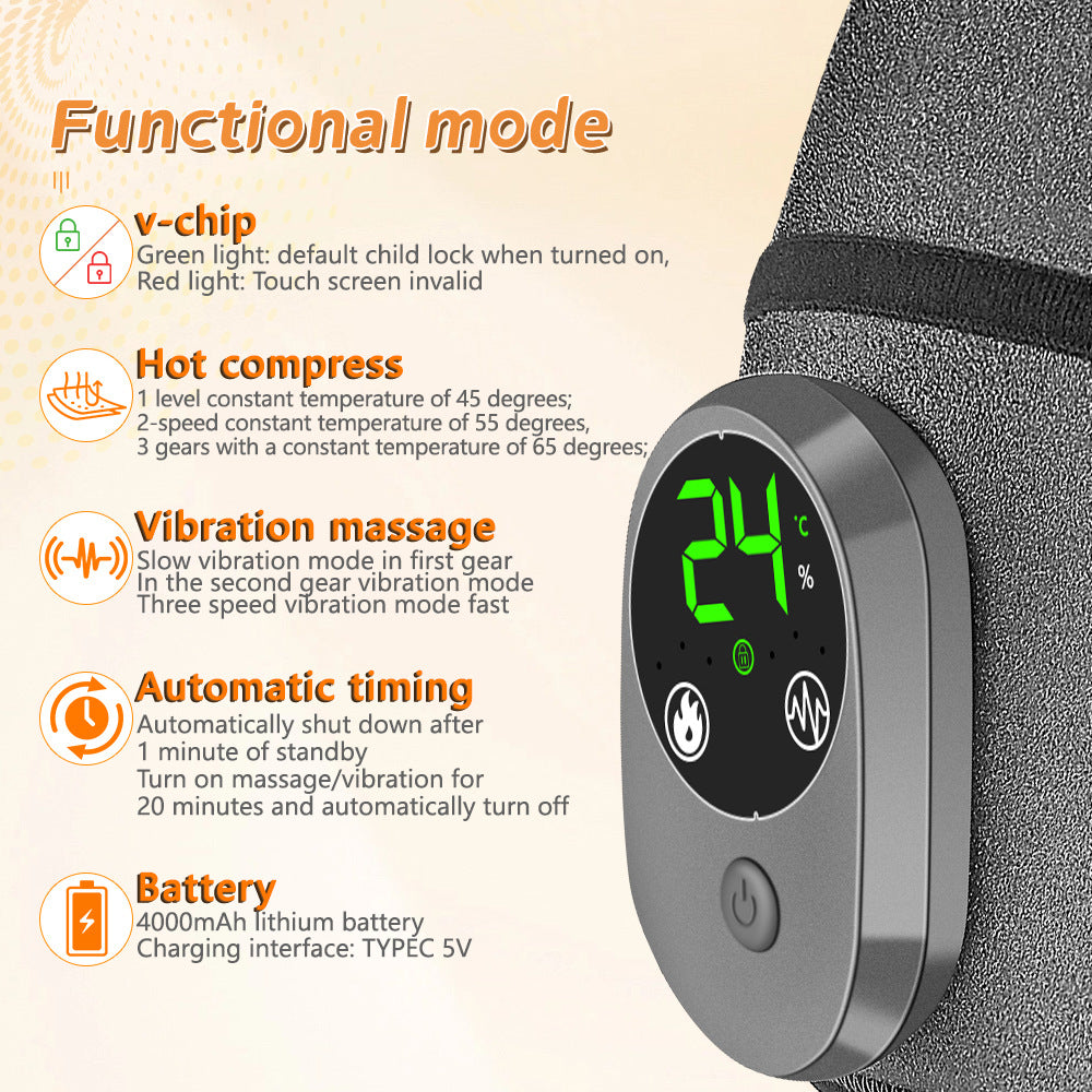 Find soothing relief from joint pain and discomfort with our versatile Heated Vibration Knee Massager Brace. This all-in-one therapeutic device combines constant temperature hot compress and multi-frequency vibration massage to alleviate pain, reduce stiffness, and promote relaxation. Designed for use on the knee, elbow, or shoulder (with included extension strap), it's perfect for post-exercise recovery, managing chronic pain, or simply unwinding after a long day. The intelligent touch control panel with a clear display allows you to easily customize your treatment with 3 heat levels (45C, 55C, 65C) and 3 vibration modes (Slow, Intermittent, Continuous/Fast). Made from bouncy, breathable, and thermal-insulating fabric, it ensures a comfortable fit. With a large 4000mAh battery, convenient Type-C charging, and smart safety features like a 20-minute auto-off timer and a child lock, it's your portable solution for targeted pain relief.