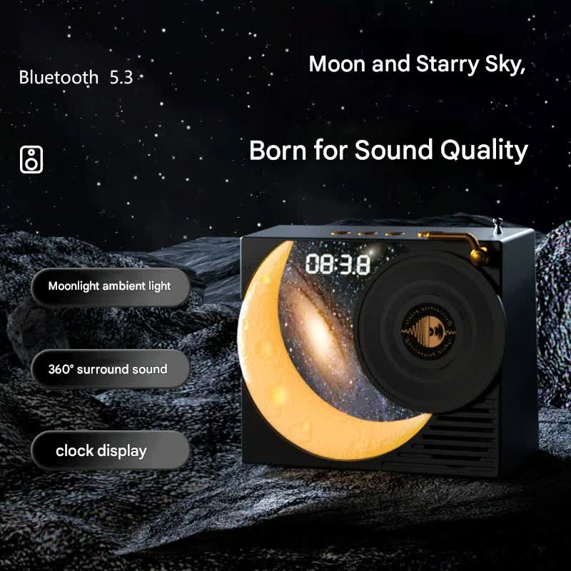 Retro Vinyl Bluetooth Speaker with Moon Ambient Light, Clock & 360 Surround Sound - P1 Model