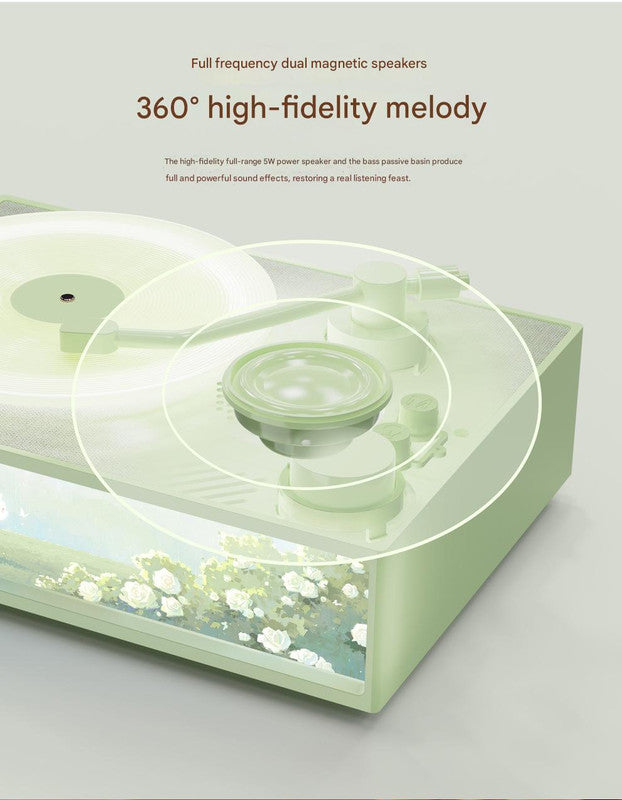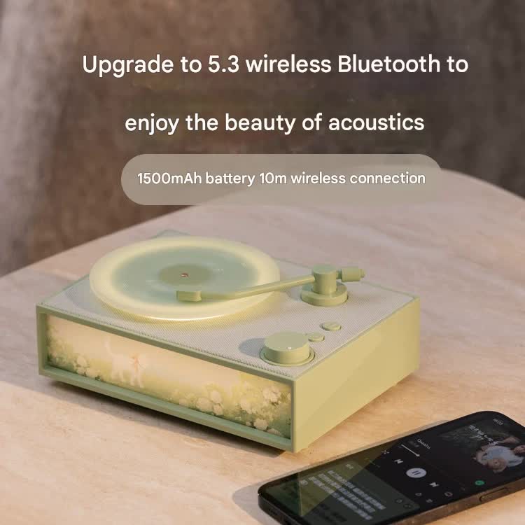 Immerse yourself in a unique sensory experience with our Retro Vinyl Record Player Bluetooth Speaker. This beautifully designed device combines classic aesthetics with modern technology, featuring a charming miniature turntable that spins and an illuminated art panel displaying picturesque scenes like Mount Fuji or serene landscapes. Enjoy rich, surround sound quality via the upgraded Bluetooth 5.3 connection, offering a wireless range of up to 10 meters. The built-in 1500mAh battery ensures extended playtime. More than just a speaker, it also functions as an ambient night light and an aroma diffuser (aroma oil typically added to the spinning disc area), creating a romantic and relaxing atmosphere in your home. Its classic vinyl record design, reinterpreted with modern aesthetics using transparent materials, makes it a stunning piece of decor and a delightful audio system.