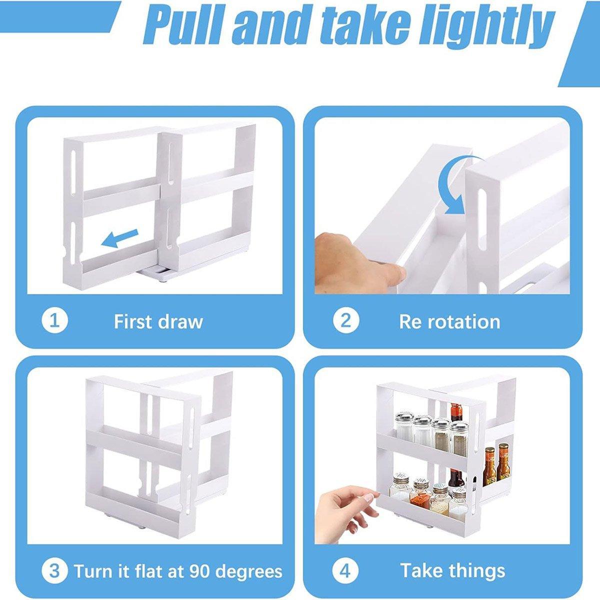 Maximise your kitchen storage space with this practical Rotating Spice Rack. Designed for easy access, this 2-tier organiser is ideal for keeping spices, herbs, and other small items neatly arranged. The unique 90-degree rotating feature allows you to pull and turn the rack, offering quick access to all contents. Compact yet spacious, it fits comfortably in a kitchen cupboard or on a countertop, bringing a modern aesthetic to any culinary space.