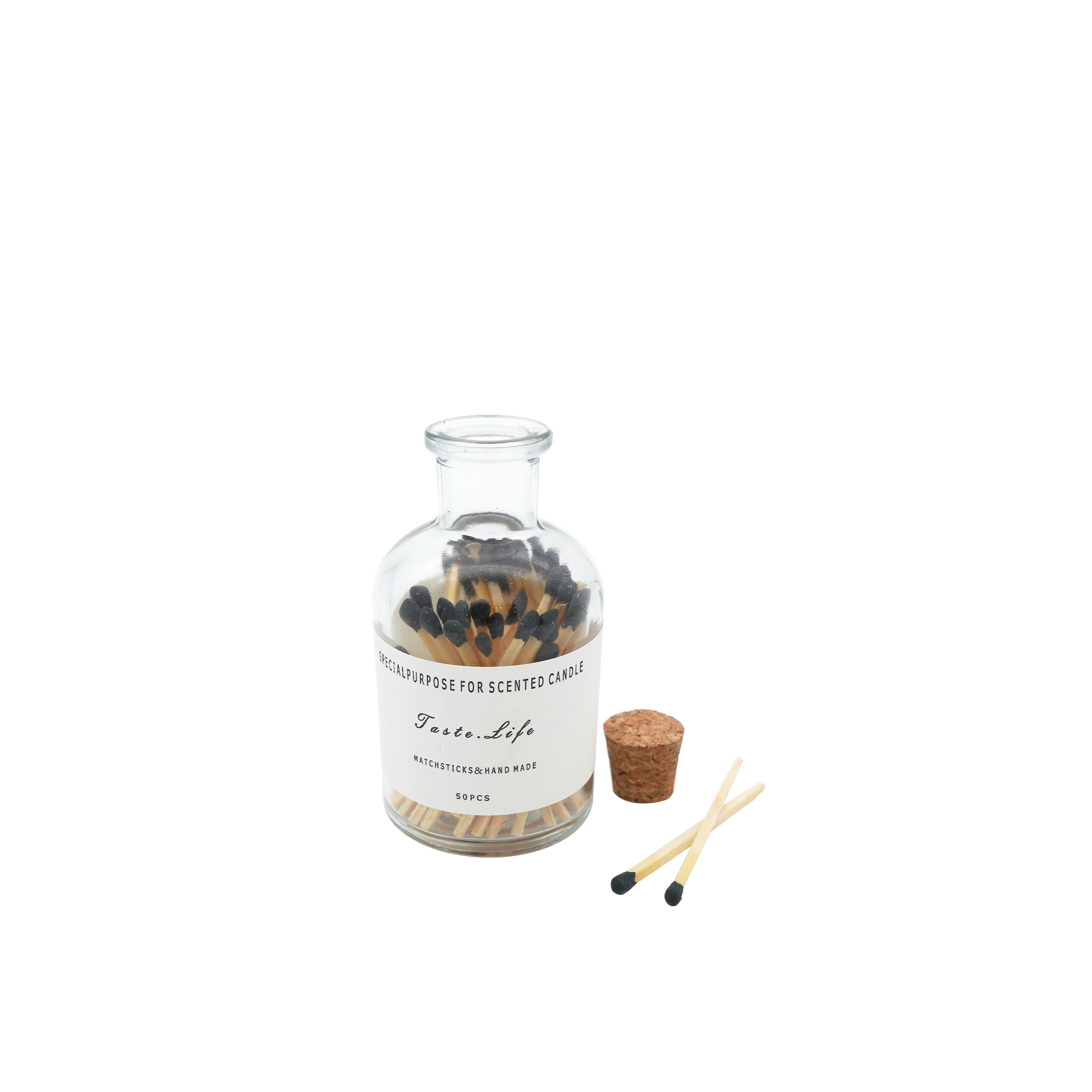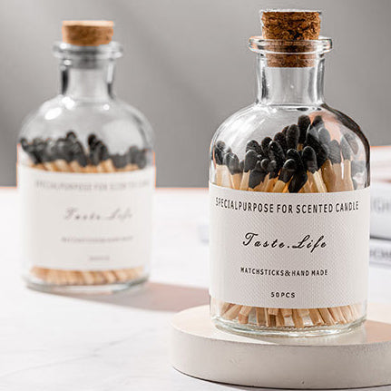 The Little Ruban matches in a chic apothecary bottle are the perfect candle companion.Match bottles are stylishly topped with a cork stopper and the striker is on the side of the jar. Each jar contains 50 matchsticks.