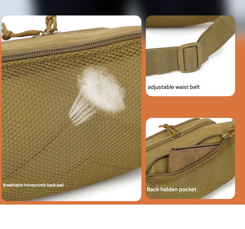 Stay prepared and organized with our versatile Tactical Waist Pack, designed for both everyday carry and specialized use. This multi-pocket fanny pack features a large capacity main compartment suitable for an iPad, phone, notebook, power bank, wallet, and other essentials. It includes strategically placed side pockets for smaller items like wireless earbuds or sunglasses. A key feature is the dedicated front compartment designed for concealed carry, with internal elastic loops to securely hold a handgun and magazines or other tools. The pack is made from durable material with a breathable honeycomb mesh back panel for comfort during extended wear. It also boasts an adjustable waist strap for a custom fit and a hidden back pocket for discreet storage of valuables. The front of the main compartment features MOLLE-compatible webbing for attaching additional pouches or gear.