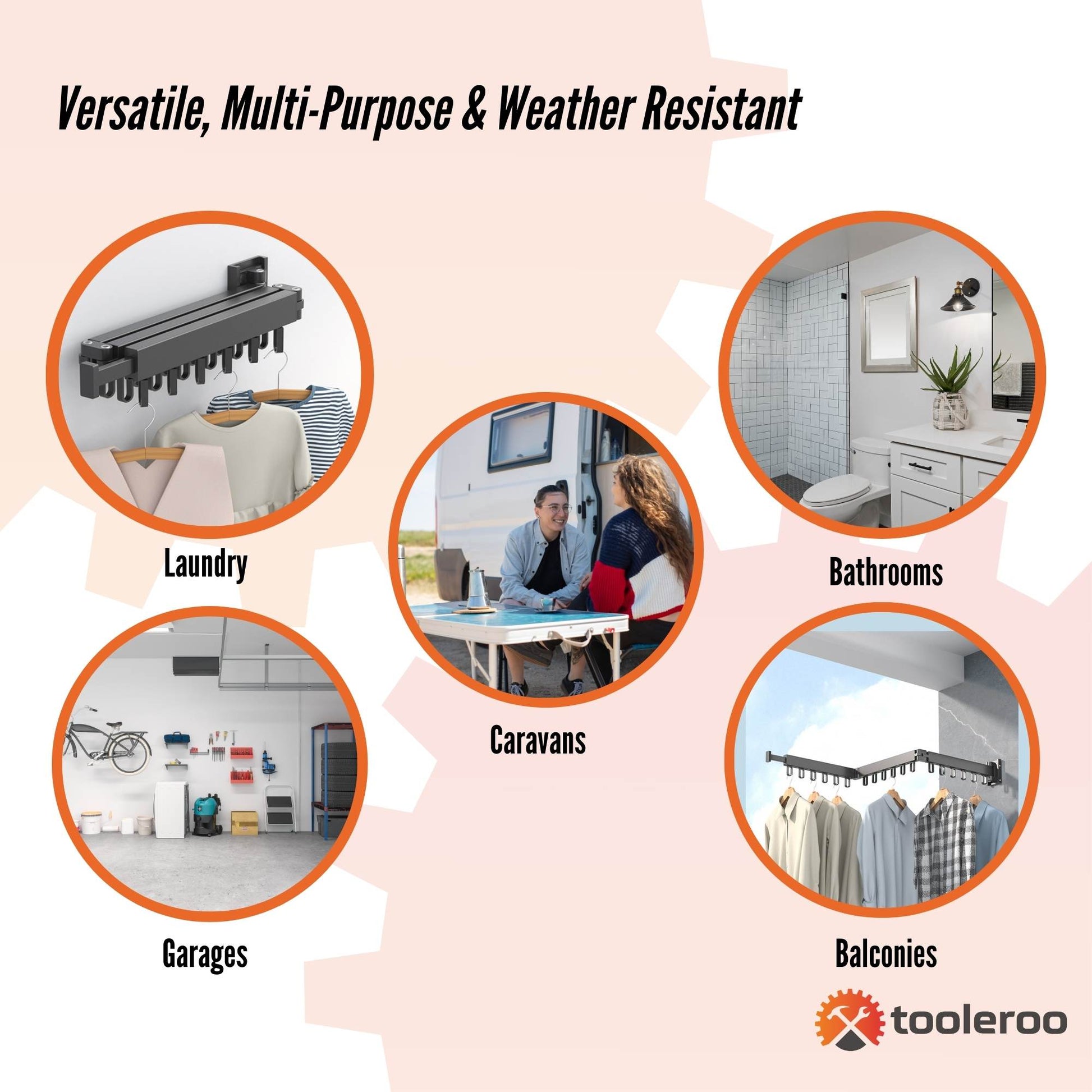 Keep your laundry neat and tidy with the Tooleroo Tri-Fold Wall-Mount Drying Rack – a space-saving, no-fuss solution for all homes. Made from rust-resistant aluminium alloy, it’s waterproof, durable, and built to last.