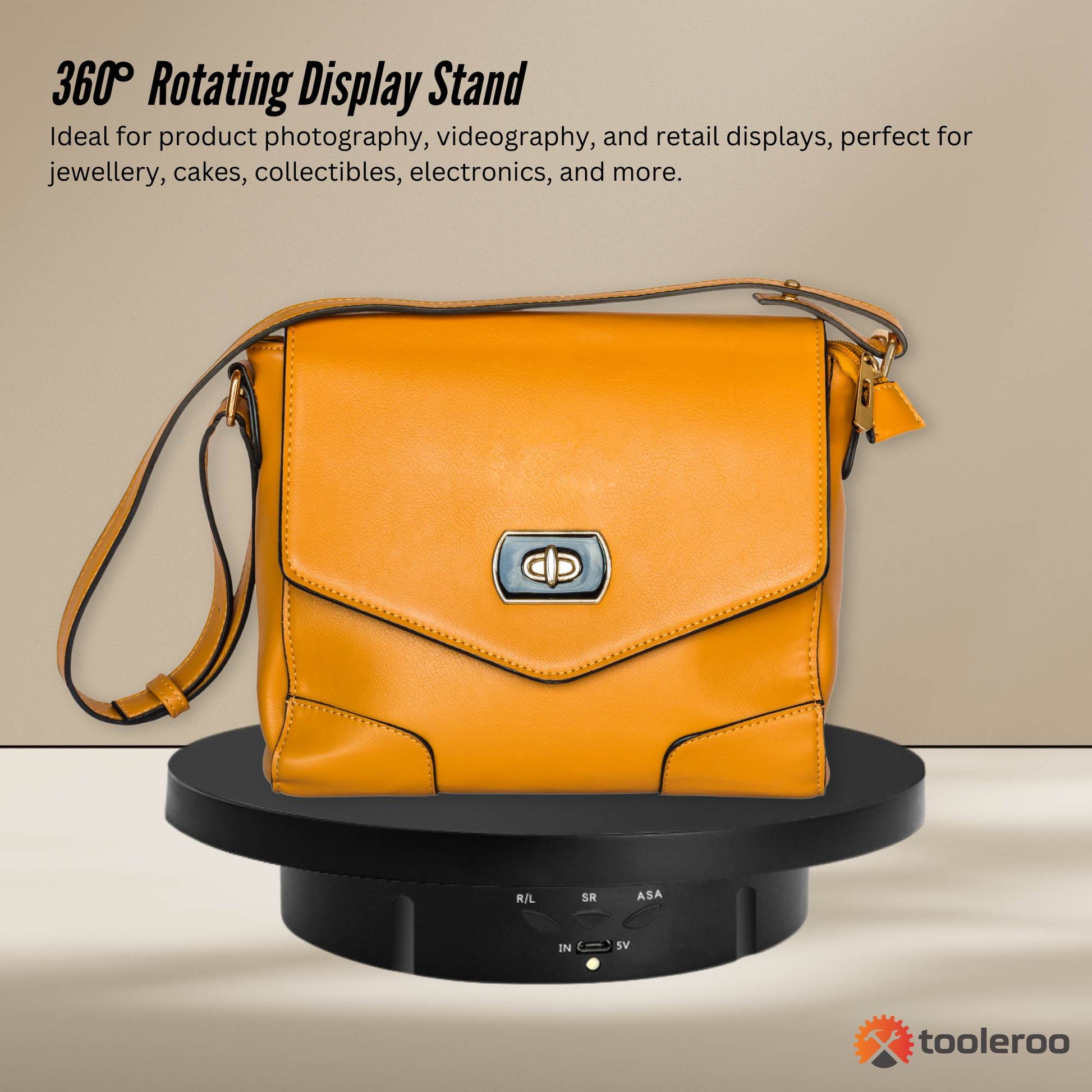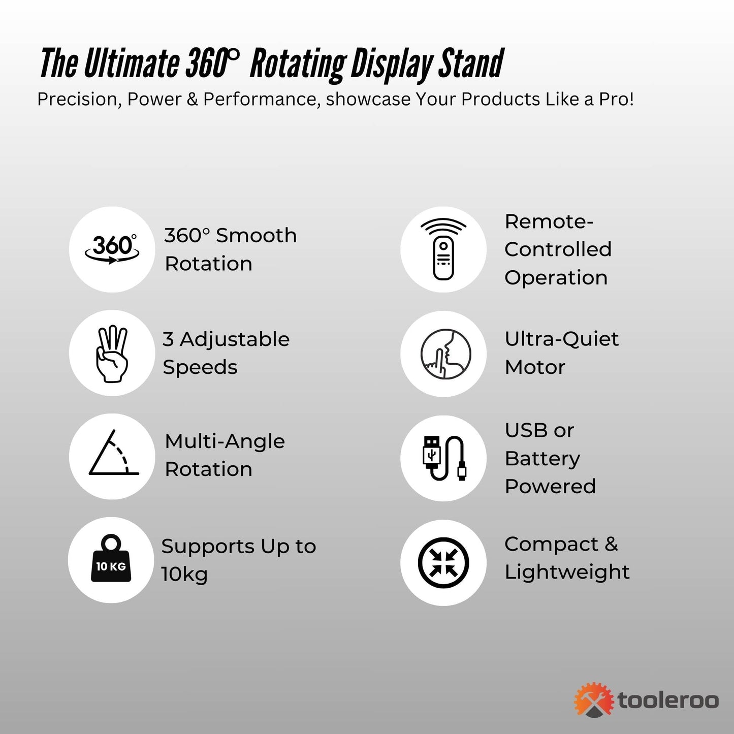 Tooleroo 3-in-1 Electric Rotating Display Stand – Elevate your product presentations with this 360° motorised turntable, designed for photography, videography, and retail displays. Featuring adjustable speeds, three interchangeable platform sizes, and multiple rotation angles, this quiet, USB-powered display stand comes with the option of using a rechargeable battery, and is perfect for showcasing jewellery, electronics, cakes, and more. Remote-controlled for effortless operation, it supports up to 10kg and ensures smooth, stable rotation—ideal for professional merchandising and content creation.