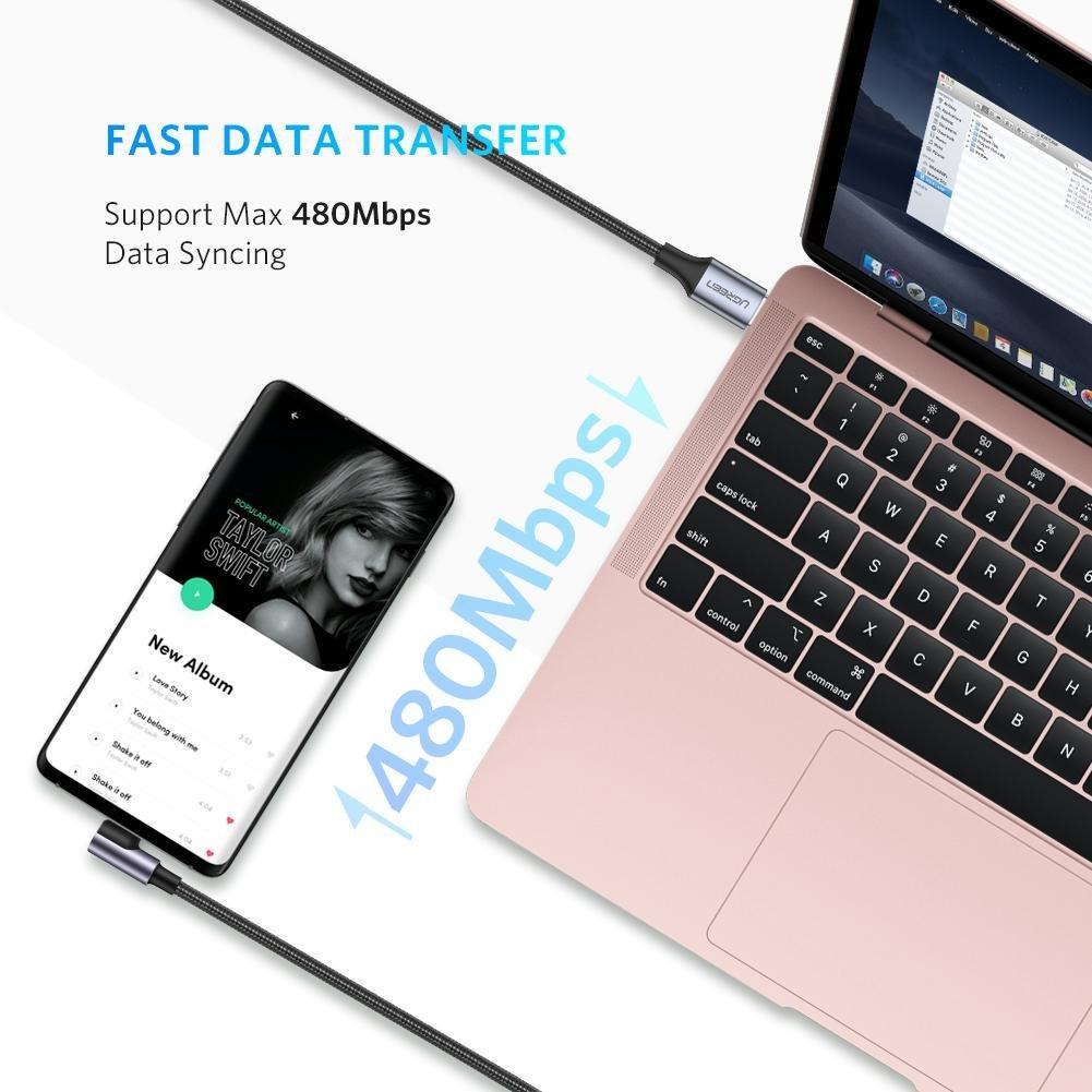 Right Angle USB C: UGREEN USB-C cable with an innovative 90 degrees L design. It's more convenient and more comfortable for playing games, watching videos, reading e-books when you lie on the couch or bed while charging. Safe and Quick Charge: This USB C to USB A cable supports Quick Charge 2.0 and 3.0, with max output up to 3A. It is fully compatible with Samsung Adaptive Fast Charging AFC and Huawei Fast Charging Protocol FCP, providing 5V 3A, 9V 2A or 12V 1.5A fast charge. With a built-in 56K resistor, this type c charger guarantees reliable conductivity and charging, protecting your cell phones from damage due to excessive current.