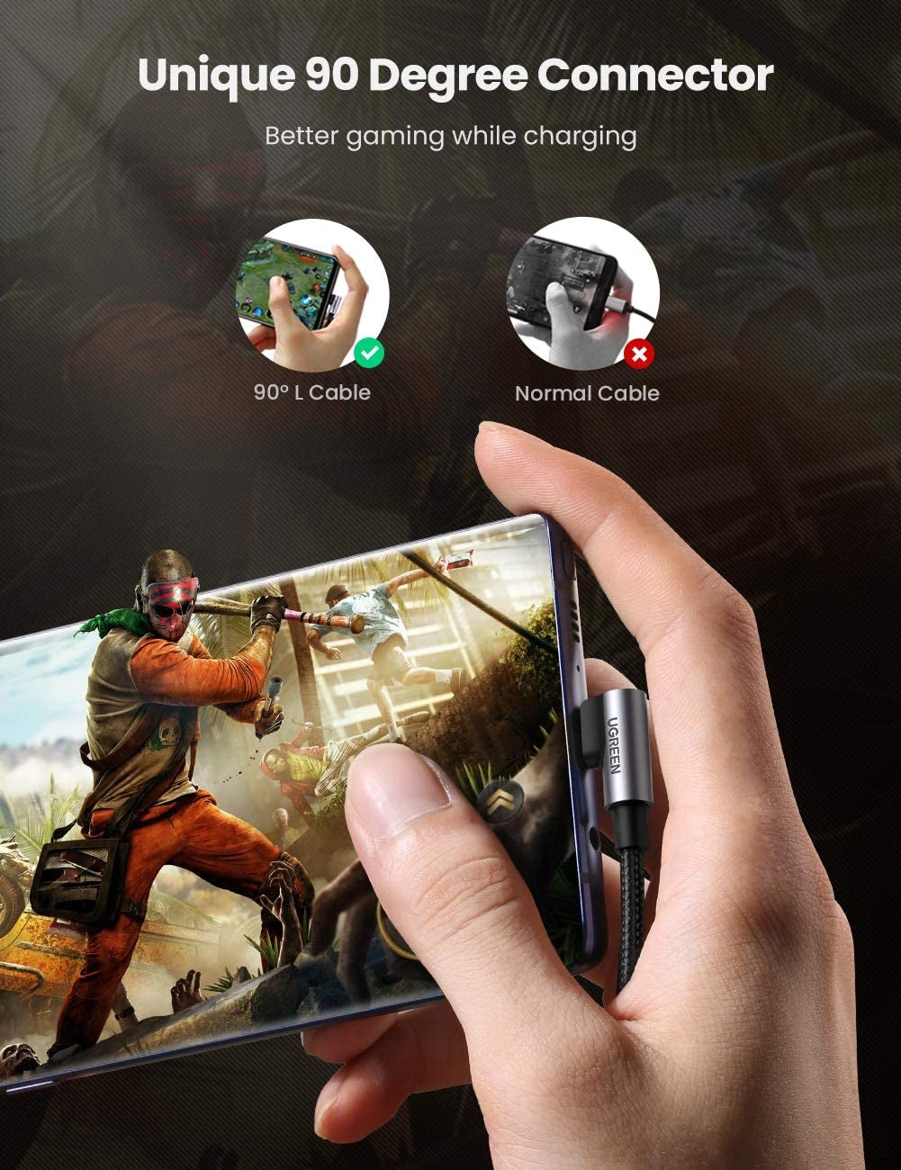 Unique Design: UGREEN USB-C to USB-C cable with an innovative 90 degrees L design, is much more convenient and more comfortable for playing games, watching videos, reading e-books when you lie on the couch or bed while charging. (Max thickness of phone case allowed is 2.5mm.)