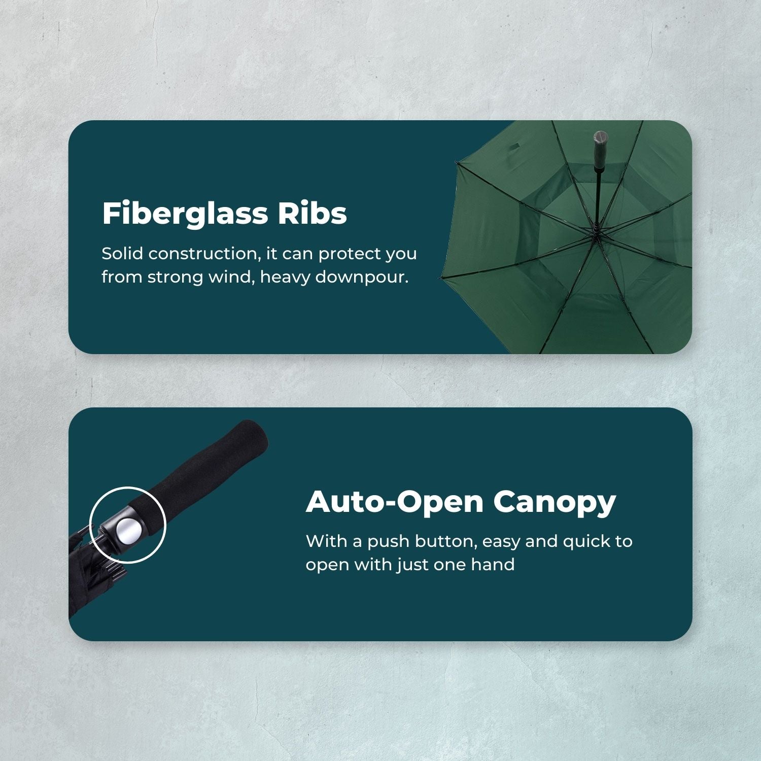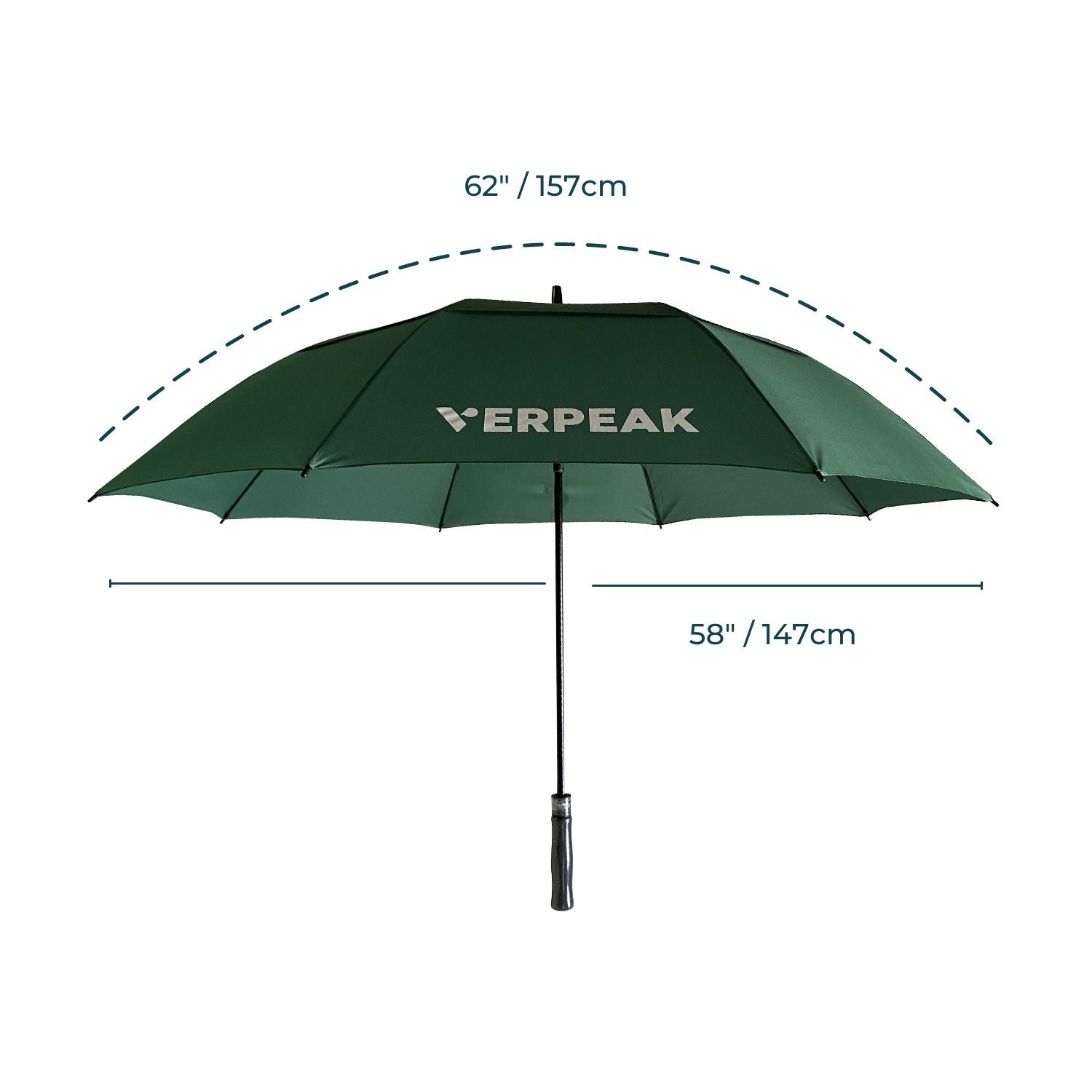 With a 62-inch Oversize canopy, Comfortable grip, Solid Fiberglass ribs, it can protect you from strong wind, heavy downpour, or even under the sun. -