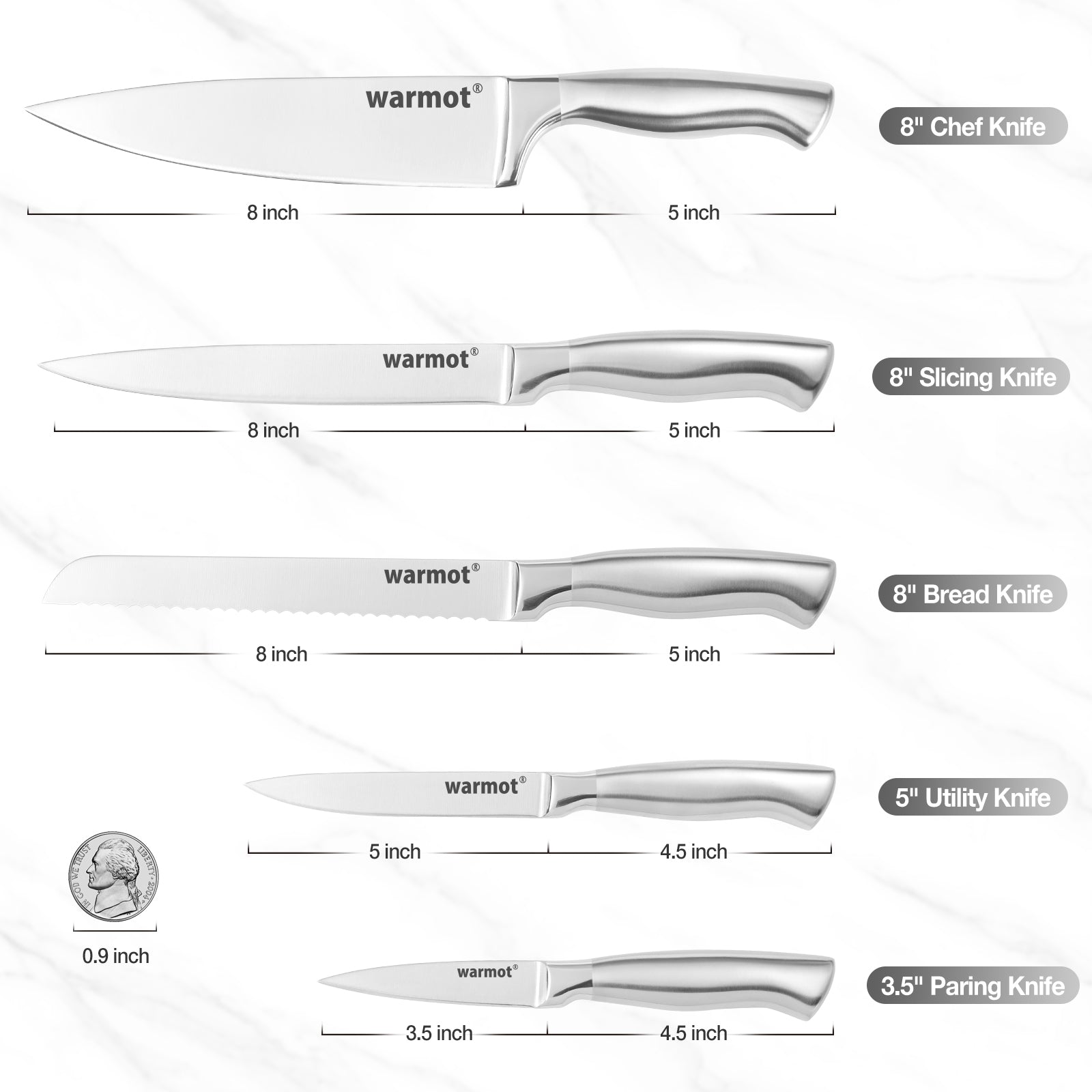 This is a perfect way to start a new knife set: 1x 8" chef knife, 1 x 8" slicing knife, 1 x 8" bread knife,1 x 5" utility knife, 1 x 3.5" paring knife. All-in-one knife sets for kitchen meets all kinds of needs of your kitchen.