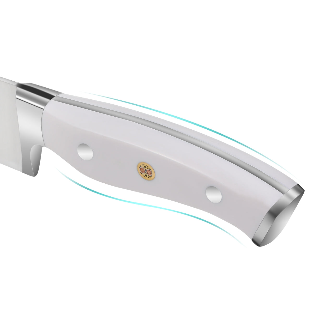 Color: 7-Pcs White Handle Brand: warmot Blade Material: German 1.4116 Stainless Steel Blade Edge: Plain Style: Ergonomic 8-inch Chef knife × 1 8-inch Slicer knife × 1 8-inch Bread knife × 1 7-inch Santoku knife × 1 5.5-inch Serrated utility knife × 1 5-inch Utility knife × 1