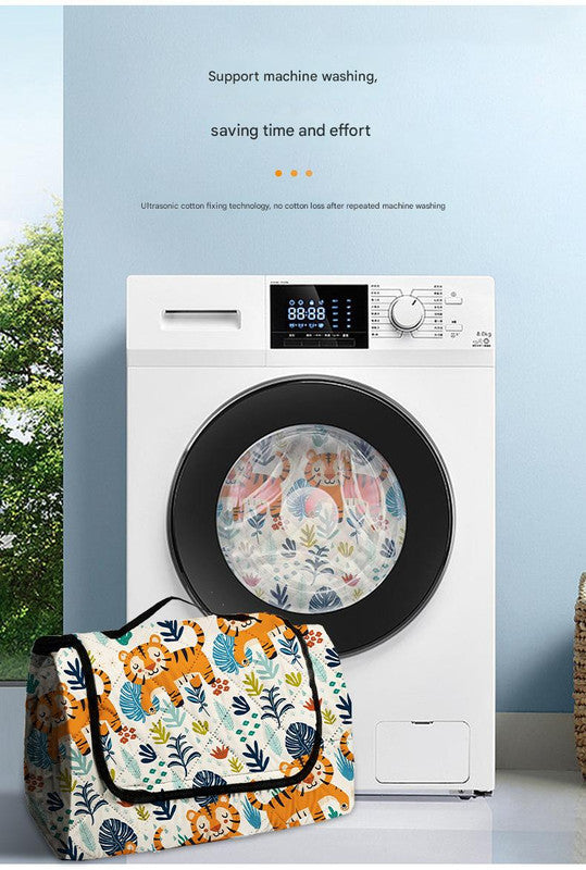 Crafted with a waterproof PEVA backing, this blanket keeps you dry by preventing moisture from seeping through, even on damp grass. The three-layer construction includes a soft fabric top, a 60g filling for added comfort, and an 80g PEVA base for durability. It folds easily into a compact size with a built-in handle for convenient carrying and storage. Versatile and easy to clean, this blanket can also be used as a protective cover for your washing machine when not in use outdoors.