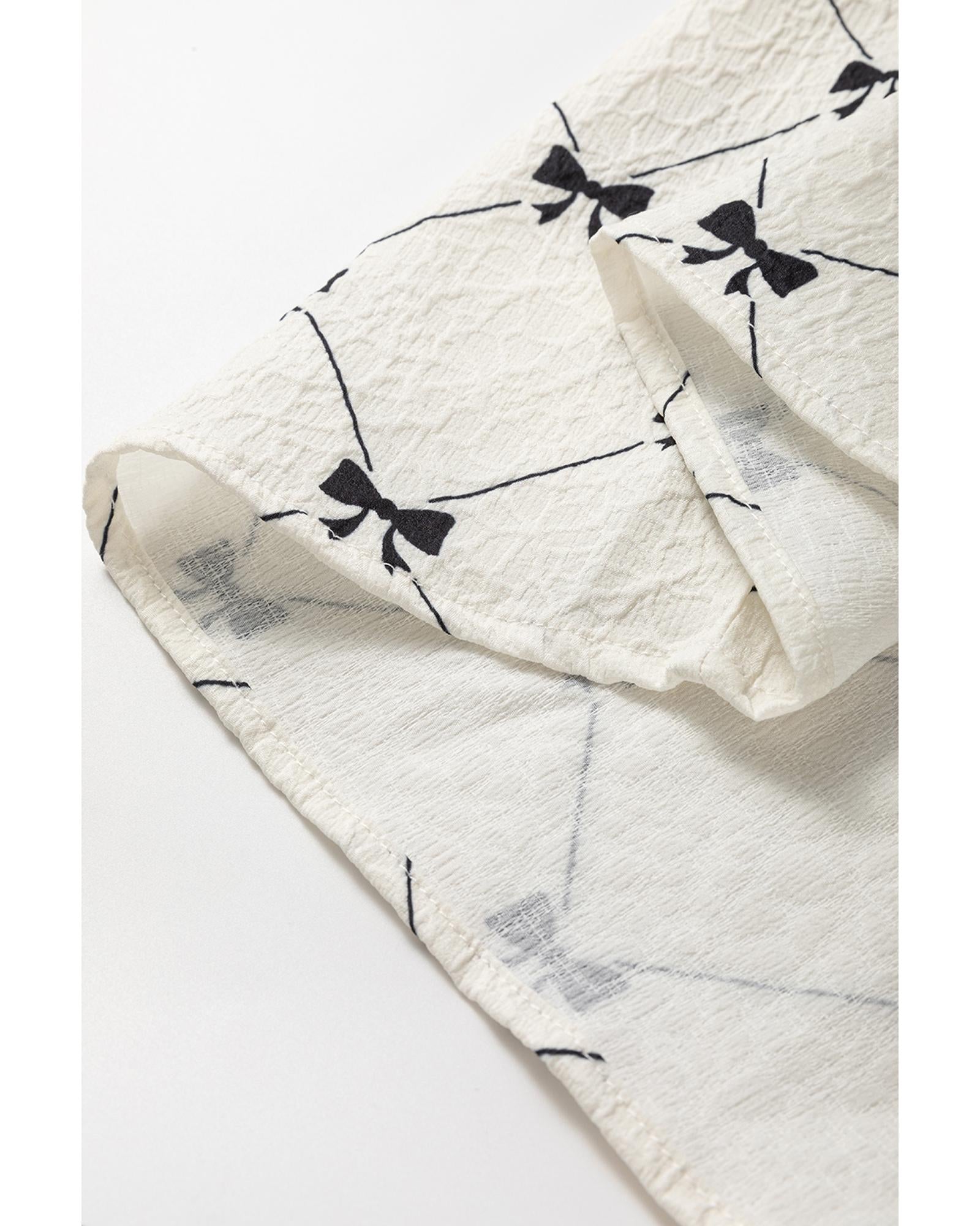 White Bowtie Pattern Textured Puff Half Sleeve Loose Mini Dress - S