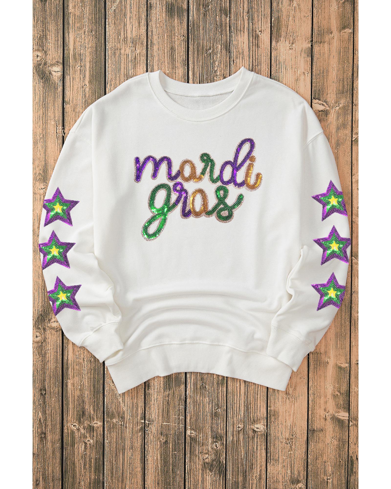 - White Sequin Mardi Gras Graphic Star Sleeve Pullover Sweatshirt