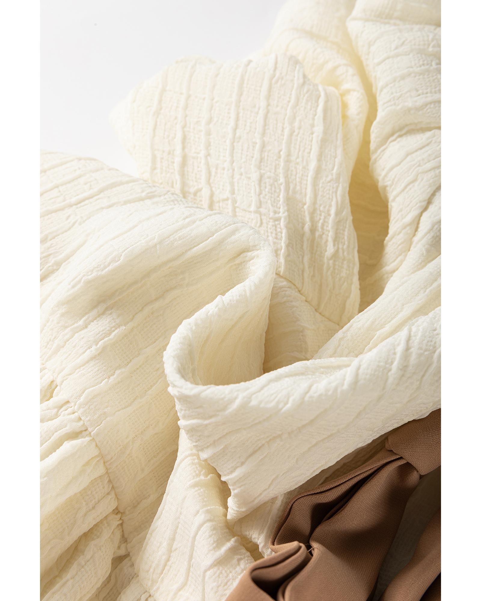 White Textured Bow Ties Front Bubble Hem Puff Short Sleeve Blouse - L